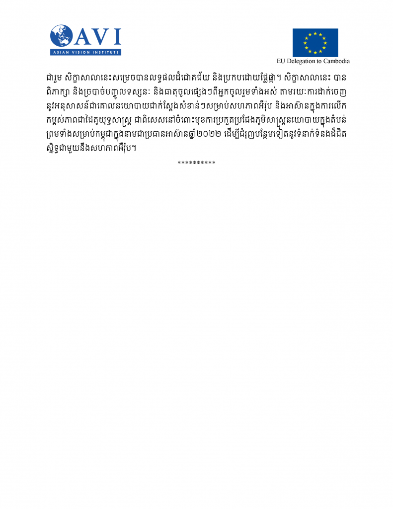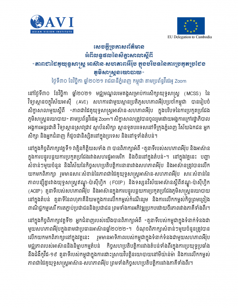 នៅថ្ងៃទី៣០ ខែវិច្ឆិកា ឆ្នាំ២០២១ មជ្ឈមណ្ឌលមេគង្គសម្រាប់ការសិក្សាយុទ្ធសាស្ត្រ (MCSS) នៃវិទ្យាស្ថានចក្ខុវិស័យអាស៊ី (AVI) សហការជាមួយស្ថានប្រតិភូសហភាពអឺរ៉ុបប្រចាំកម្ពុជា បានរៀបចំសិក្ខាសាលាមួយស្តីពី «ភាពជាដៃគូយុទ្ធសាស្រ្ដអាស៊ាន-សហភាពអឺរ៉ុប ក្នុងបរិបទនៃការប្រកួតប្រជែងភូមិសាស្រ្ដនយោបាយ» តាមប្រព័ន្ធវីដេអូ Zoom។ សិក្ខាសាលាត្រូវបានចូលរួមដោយអង្គការក្រៅរដ្ឋាភិបាល អង្គការអន្តរជាតិ វិទ្យាស្ថានស្រាវជ្រាវ ស្ថាប័នសិក្សា ស្ថានទូតបរទេសនៅទីក្រុងភ្នំពេញ វិស័យឯកជន អ្នកសិក្សានិងអ្នកជំនាញ ក៏ដូចជានិស្សិតនៅក្នុងប្រទេស និងនៅទូទាំងតំបន់។