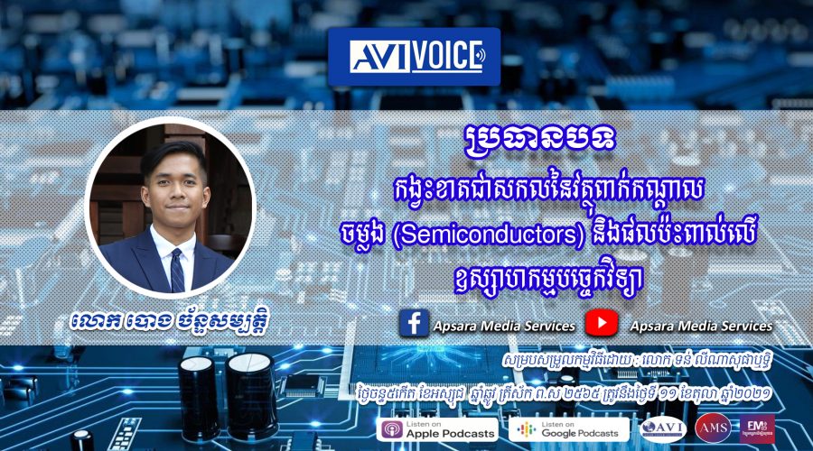 វត្ថុពាក់កណ្ដាលចម្លង (Semiconductor) ឬអាចហៅម៉្យាងទៀតបានថាជា បន្ទះឈីប ជាធាតុផ្សំដ៏សំខាន់នៅក្នុងវិស័យបច្ចេកវិទ្យាដែលមិនអាចខ្វះបាន ហើយវាក៏ជះឥទ្ធិពលទៅលើជីវភាពរស់នៅប្រចាំថ្ងៃរបស់យើងផងដែរ។ បច្ចុប្បន្ន ផលិតកម្មនៃវត្ថុពាក់កណ្ដាលចម្លងនេះ ត្រូវបានប្រទេសមហាអំណាចយកមកប្រកួតប្រជែងគ្នាក្នុងវិស័យឧស្សាហកម្មបច្ចេកវិទ្យា ជាពិសេសប្រទេសដែលសម្បូរទៅដោយវត្ថុធាតុដើម និងបច្ចេកវិទ្យាសម្រាប់ការផលិតនេះ។ ក្នុងកិច្ចសម្ភាហ៍នេះ លោក បោង ច័ន្ទសម្បត្តិ បានពន្យល់អំពីសារសំខាន់នៃវត្ថុពាក់កណ្ដាលចម្លង សម្រាប់ជីវភាពរបស់នៅរបស់យើង ក៏ដូចជាផលប៉ះពាល់នៃកង្វះខាតវត្ថុពាក់កណ្ដាលចម្លងនៅក្នុងវិស័យឧស្សាហកម្មបច្ចេកវិទ្យានាពេលបច្ចុប្បន្ន។