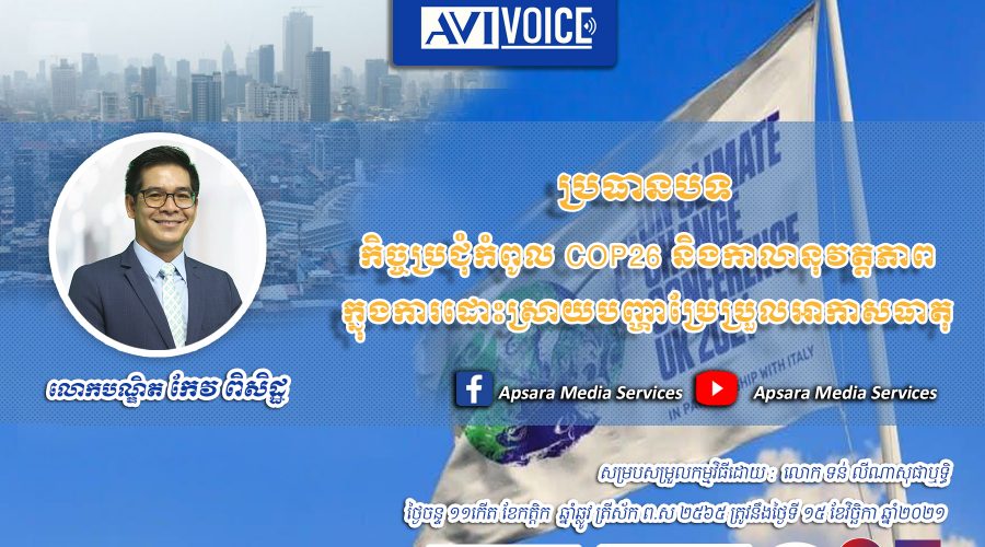 មហាសន្និបាទស្ដីពីអាកាសធាតុរបស់អង្គការសហប្រជាជាតិនៅទីក្រុងក្លាស្កូ ប្រទេសស្កុតឡេន ទើបតែបានបញ្ចប់ទៅកាលពីថ្ងៃទី១២ ខែវិច្ឆិកា ឆ្នាំ២០២១ កន្លងទៅនេះ។ កិច្ចប្រជុំនេះត្រូវបានគេចាត់ទុកថាជាកិច្ចប្រជុំដ៏សំខាន់មួយ ដែលជាវេទិកាសម្រាប់ឲ្យប្រទេសអភិវឌ្ឍន៍ធ្វើការប្តេជ្ញាចិត្តទៅលើការដោះស្រាយបញ្ហាការប្រែប្រួលអាកាសធាតុ និងផ្ដល់នូវកាលានុវត្តភាពដល់ប្រទេសក្រីក្រ និងប្រទេសកំពុងអភិវឌ្ឍន៍ក្នុងការទប់ស្កាត់ការរងគ្រោះពីការប្រែប្រួលអាកាសធាតុ។ ក្នុងកិច្ចសម្ភាហ៍នេះ លោកបណ្ឌិត កែវ ពិសិដ្ឋ បានបន្យល់អំពីគោលការណ៍ និងរបៀបវារៈនៃក្រមខណ្ឌ COP របស់អង្គការសហប្រជាជាតិ ក៏ដូចជាលទ្ធផលនៃកិច្ចប្រជុំនេះផងដែរ។