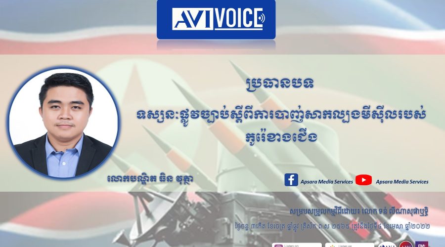 នៅប៉ុន្មានខែចុងក្រោយនេះ គេមើលឃើញពីសកម្មភាពដ៏មម៉ាញឹករបស់ប្រទេសកូរ៉េខាងជើងក្នុងការបើកដំណើរការការបាញ់សាកល្បងមីស៊ីលរបស់ខ្លួនជាបន្តបន្ទាប់។ សកម្មភាពរបស់កូរ៉េខាងជើងនេះបានបង្កជាក្ដីព្រួយបារម្ភដល់សហគមន៍អន្តរជាតិ ជាពិសេសនោះប្រទេសជិតខាងនិងប្រទេសនានាក្នុងតំបន់ ពាក់ព័ន្ធទៅនឹងសន្តិសុខ និងសុវត្តិភាពតំបន់ទាំងមូល។ ក្នុងកិច្ចសម្ភាសន៍នេះ លោកបណ្ឌិត ធិន វុត្ថា បានពន្យល់អំពីមហច្ឆតា និងគោលបំណងចម្បងរបស់កូរ៉េខាងជើងក្នុងការបន្តនូវការពង្រឹងសមត្ថភាពអាវុធនុយក្លេអ៊ែររបស់ខ្លួន និងបានផ្ដល់នូវទិដ្ឋភាពផ្នែកច្បាប់ពាក់ព័ន្ធទៅនឹងសកម្មភាពនៃការបាញ់សាកល្បងមីស៊ីលរបស់កូរ៉េខាងជើងផងដេរ ក៏ដូចជាផលប៉ះពាល់និងការគំរាមកំហែងនានាទៅដល់តំបន់ និងអន្តរជាតិទាំងមូល។