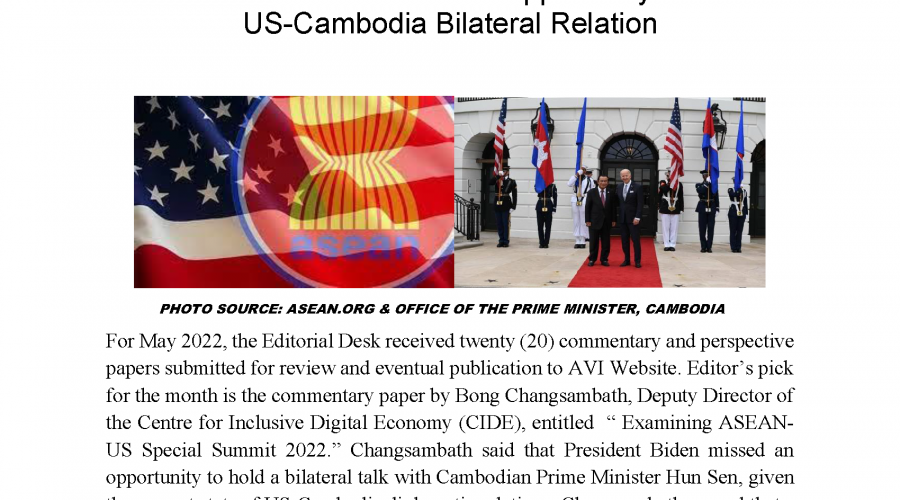 For May 2022, the Editorial Desk received twenty (20) commentary and perspective papers submitted for review and eventual publication to AVI Website. Editor’s pick for the month is the commentary paper by Bong Changsambath, Deputy Director of the Centre for Inclusive Digital Economy (CIDE), entitled “ Examining ASEAN-US Special Summit 2022.” Changsambath said that President Biden missed an opportunity to hold a bilateral talk with Cambodian Prime Minister Hun Sen, given the current state of US-Cambodia diplomatic relations. Changsambath argued that a bilateral meeting would have allowed the two leaders to build personal rapport concerning issues of common interests. These issues are climate change, trade relations and sensitive issues surrounding the Ream Naval Base causing friction between Washington and Phnom Penh.