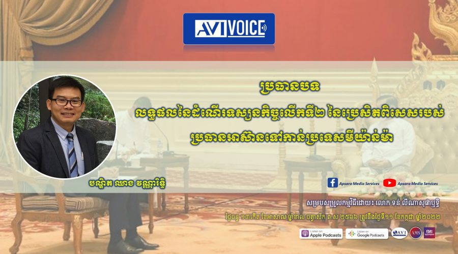 កាលពីថ្ងៃទី៣០ ខែមិថុនា រហូតដល់ថ្ងៃទី០៣ ខែកក្កដា ឆ្នាំ២០២២ ឯកឧត្តម ឧបនាយករដ្ឋមន្ត្រី ប្រាក់ សុខុន រដ្ឋមន្ត្រីក្រសួងការបរទេស និងកិច្ចសហប្រតិបត្តិការអន្តរជាតិនៃព្រះរាជាណាចក្រកម្ពុជា ក្នុងតួនាទីជាប្រេសិតពិសេសនៃប្រធានអាស៊ានស្ដីពីមីយ៉ាន់ម៉ា បានដឹកនាំនូវគណៈប្រតិភូទៅបំពេញទស្សនកិច្ចការងារលើកទី២ នៅប្រទេសមីយ៉ាន់ម៉ា។ ក្នុងនោះក៏មានការអមដំណើរដោយ ឯកឧត្ដម ឯកផាប់ ផាន់ថាវង្ស ដែលជាអគ្គលេខាធិការរងអាស៊ានទទួលបន្ទុកសហគមន៍សង្គមវប្បធម៌អាស៊ាន(ASCC) ផងដែរ។ ហើយគួររំឭកផងដែរ ថាគោលបំណងចម្បងនៃទស្សនកិច្ចលើកទី២នេះគឺដើម្បីជំរុញការអនុវត្តនូវកិច្ចព្រមព្រៀងឯកច្ឆន្ទទាំង៥ចំណុចរបស់មេដឹកនាំអាស៊ាន ក៏ដូចជាពន្លឿនការផ្តល់ជំនួយមនុស្សធម៌ និងកម្មវិធីចាក់វ៉ាក់សាំងរួម ដែលត្រូវបានអនុម័តនៅក្នុង «កិច្ចប្រជុំពិគ្រោះយោបល់ស្ដីពីជំនួយមនុស្សធម៌អាស៊ានដល់មីយ៉ាន់ម៉ា» ដែលធ្វើឡើងកាលពីថ្ងៃទី០៦ ខែឧសភាកន្លងទៅនេះ ហើយដើម្បីបង្កើនបរិយាកាសអំណោយផលសម្រាប់ការសន្ទនានយោបាយប្រកបដោយបរិយាប័ន្នផងដែរ។