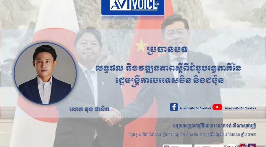 លោក វុន ផានិត៖ បាទសូមអរគុណ។ ជំនួបទ្វេភាគីរវាងរដ្ឋមន្ត្រីការបរទេសចិន និងជប៉ុន ដែលបានកើតឡើងនៅក្នុងប្រទេសចិនពីថ្ងៃទី១ ដល់ថ្ងៃទី២ ក្នុងខែនេះ។ ជាក់ស្តែង វាមិនមែនជារឿងថ្មីទេដែលថ្នាក់ដឹកនាំចិន ក៏ដូចជាថ្នាក់ដឹកនាំជប៉ុនទៅទស្សនកិច្ចទៅ វិញទៅមក ដោយនេះបើតាមការសិក្សាស្រាវជ្រាវកន្លងមកគឺយើងឃើញចាប់ពីឆ្នាំ ២០១៤មក នាយករដ្ឋមន្ត្រី អាបេ បានធ្វើទស្សនកិច្ចនៅប្រទេសចិន រហូតដល់ឆ្នាំ២០១៩ គឺមានជំនួប ២ទៅ៣ ដងរួចមកហើយ។ ជាក់ស្តែងចិនដែលធ្វើទស្សនកិច្ចទៅកាន់ជប៉ុនវិញ ក៏មានចាប់ពីឆ្នាំ២០១១ ដល់ ២០១៩ តាមរយៈនាយករដ្ឋមន្ត្រីរបស់ចិន ក៏ដូចជាប្រធានាធិបតីជាដើម។ ក្នុងដំណើរទស្សនកិច្ចនោះប្រទេសទាំង២បានសិក្សាស្វែងយល់ពីគ្នដើម្បីដោះស្រាយបញ្ហាជម្លោះដែលនៅសេសសល់ ក៏ដូចជាកាតបន្ថយនូវភាពតានតឹងនៅក្នុងបញ្ហាភូមិ សាស្រ្តនយោបាយ ជាពិសេសរឿងដែលពាក់ព័ន្ធជាមួយជម្លោះលើកោះសមុទ្រចិន ខាងកើត។ ពាក់ព័ន្ធជាមួយទស្សនកិច្ចថ្មីៗនេះគឺលោករដ្ឋមន្ត្រីការបរទេសជប៉ុន បានធ្វើទស្សនកិច្ចទៅកាន់ប្រទេសចិន ក្នុងនោះលោកបានជួបសមភាគីរបស់លោក ដែលប្រធានបានលើកយកមកពិភាក្សាមានដូចជាសមុទ្រចិនខាងកើត ការដោះលែងអ្នកទោសរបស់ជប៉ុនដែលបានជាប់ឃុំឃាំង ជាក់ស្តែងក៏បានពិភាក្សាលើបញ្ហាមួយចំនួនដែលពាក់ព័ន្ធជាមួយនឹងពាណិជ្ជកម្ម CHIPS។