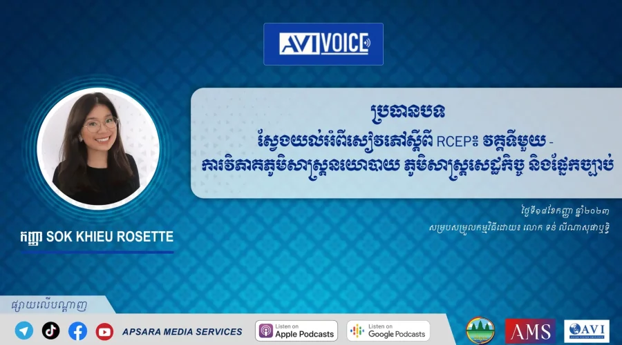 កាលពីថ្ងៃទី១៩ ខែសីហា ឆ្នាំ២០២៣ មជ្ឈមណ្ឌលសិក្សាការស្រាវជ្រាវកម្រិតខ្ពស់ និងផ្នែកច្បាប់ នៃវិទ្យាស្ថានចក្ខុវិស័យអាស៊ី បានប្រារព្វពិធីដាក់ឱ្យប្រើប្រាស់ជាផ្លូវការនៃសៀវភៅស្ដីពី “Regional Comprehensive Economic Partnership: Part 1 – Geo-Political, Geo-Economic and Legal Analysis” ដែលសៀវភៅនៃផ្ដោតសំខាន់ទៅលើទិដ្ឋភាពបីដែលរួមមានភូមិសាស្រ្តនយោបាយ ភូមិសាស្រ្តសេដ្ឋកិច្ច និងផ្នែកច្បាប់លើការអនុវត្តនៃកិច្ចព្រមព្រៀង RCEP។ ក្នុងកិច្ចសម្ភាសន៍នេះ កញ្ញា SOK Khieu Rosette នឹងពន្យល់អំពីគោលបំណង និងគុណតម្លៃនៃការតាក់តែងសៀវភៅមួយក្បាលនេះ ក៏ដូចជាសារៈសំខាន់ជាធាតុចូលគោលនយោបាយសម្រាប់ការអនុវត្តជាក់ស្ដែងនៃកិច្ចព្រមព្រៀងសេរីមួយនេះ។