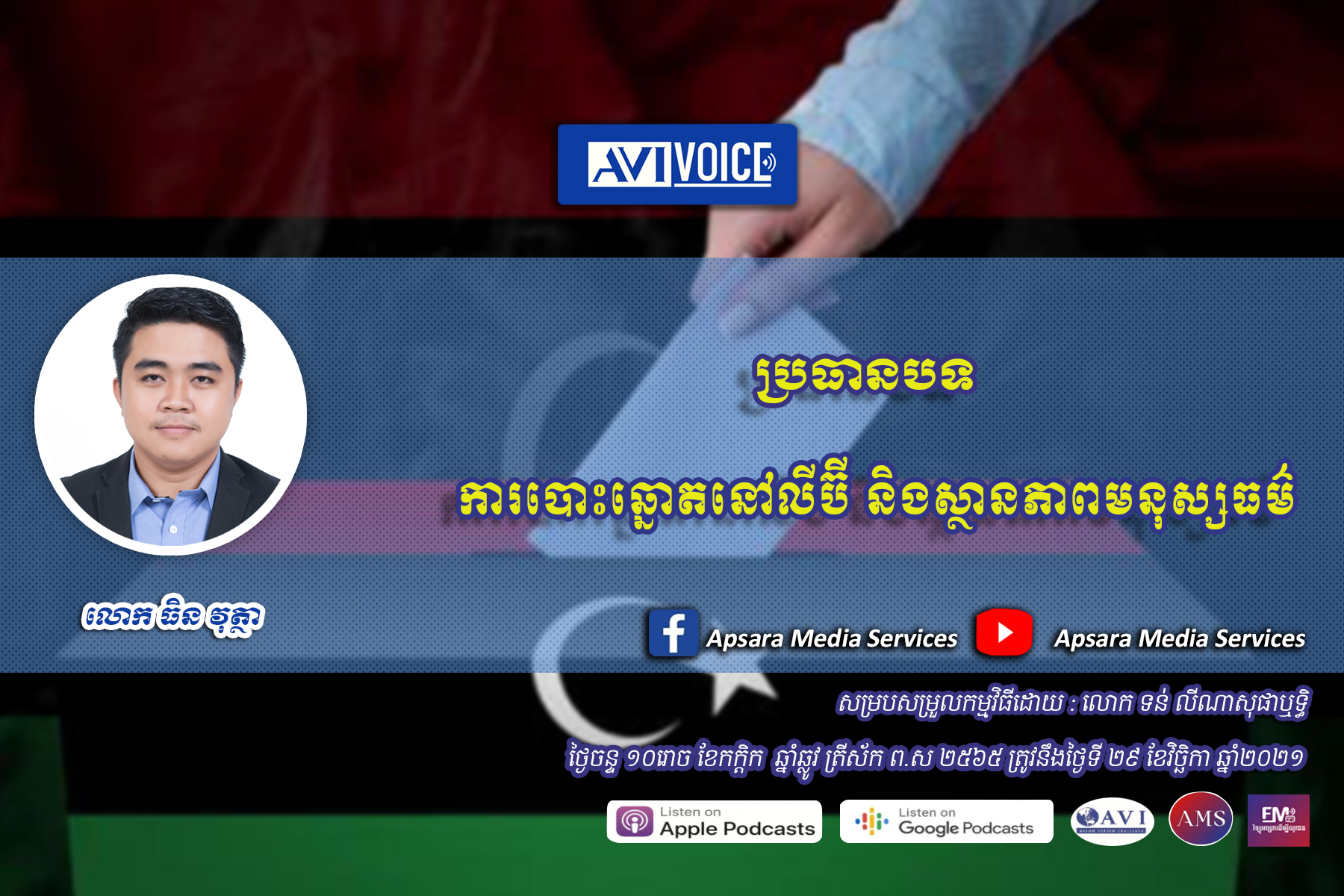 AVI Voiceការបោះឆ្នោតនៅលីប៊ី និងស្ថានភាពមនុស្សធម៌AVI Voiceការបោះឆ្នោតនៅលីប៊ី និងស្ថានភាពមនុស្សធម៌AVI Voiceការបោះឆ្នោតនៅលីប៊ី និងស្ថានភាពមនុស្សធម៌ នៅថ្ងៃទី២៤ ខែធ្នូ ឆ្នាំ២០២១ខាងមុខនេះ ប្រទេសលីប៊ីនឹងបើកការបោះឆ្នោតជ្រើសរើសប្រធានាធិបតីរបស់ខ្លួន បន្ទាប់ពីមានការពន្យាពេលបោះឆ្នោតតាំងពីឆ្នាំ២០១៨ ហើយក៏មានការចូលរួមពីសំណាកតួអង្គអន្តរជាតិជាច្រើនរួមមានអង្គការសហប្រជាជាតិ និងសហរដ្ឋអាមេរិកជាដើម។ បើទោះជាយ៉ាងណា ស្ថានភាពនៃវិបត្តិមនុស្សធម៌នៅលីប៊ីនៅតែបន្តអូសបន្លាយ ដោយសារតែអស្ថិរភាពនយោបាយ សន្តិសុខ និងសង្គមចាប់តាំងពីរបបរបស់លោក Gaddafi ត្រូវបានដួលរលំនៅឆ្នាំ២០១១។ ក្នុងកិច្ចសម្ភាហ៍នេះ លោក ធិន វុត្ថា បានបកស្រាយពីទិដ្ឋភាពទូទៅនៃការបោះឆ្នោតនៅលីប៊ីខាងមុខនេះ និងមូលហេតុធំចម្បងដែលបង្កនូវវិបត្តិមនុស្សធម៌ដ៏រាំរ៉ៃនៅប្រទេសនេះ។ សំណួរទី ១៖  ប្រទេសលីប៊ីបានប្រកាសពីការបោះឆ្នោតជាសកលរបស់ខ្លួននៅថ្ងៃទី២៤ ខែធ្នូ ឆ្នាំ២០២១ ខាងមុខនេះ។ តើការបោះឆ្នោតនៅប្រទេសលីប៊ីមានដំណើរការបែបណា? ហេតុអ្វីបានជាការបោះឆ្នោតដែលគ្រោងនឹងធ្វើឡើងតាំងពីឆ្នាំ២០១៨ ត្រូវបានពន្យារហូតដល់ពេលនេះ? ខ្ញុំយល់ឃើញថា ដែលការបោះឆ្នោតនៅលីប៊ីគ្រោងធ្វើឡើងតាំងពីឆ្នាំ២០១៨ ប៉ុន្តែមិនអាចដំណើរការបានរហូតមកដល់បច្ចុប្បន្ននេះគឺ មែនទែនទៅយើងបានដឹងហើយថាគម្រោងរបស់លីប៊ីរៀងចំការបោះឆ្នោតនៅខែធ្នូ ឆ្នាំ២០១៨ ប៉ុន្តែដោយសារតែស្ថានភាពនៅលីប៊ីមានភាពរកាំរកូស ជម្លោះផ្ទៃក្នុង ការបាញ់បោះ ក៏ដូចជាអស្ថិរភាពជាដើម ដែលជាហេតុធ្វើឱ្យគម្រោងការរៀបចំការបោះឆ្នោតនៅចុងឆ្នាំ២០១៨ នេះមិនអាចដំណើរការបាន។ ហើយកាលនោះ ក៏មានអ្នកតំណាងរបស់អង្គការសហប្រជាជាតិផងដែរគឺ លោក Ghassan Salamé ​​បានប្រកាសពន្យាពេលការបោះឆ្នោតនេះដោយសំអាងទៅលើបញ្ហាដូចបានរៀបរាប់ខាងលើ។ ប៉ុន្តែរហូតមកដល់ឆ្នាំ២០១៩ កូនប្រុសរបស់អតីតប្រធានាធិបតីលីប៊ី...