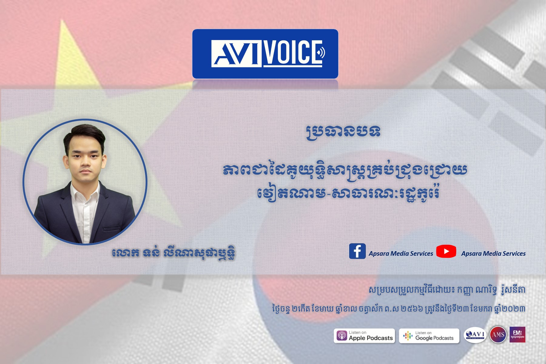 AVI Voiceភាពជាដៃគូយុទ្ធសាស្រ្តគ្រប់ជ្រុងជ្រោយវៀតណាម-កូរ៉េខាងត្បូងAVI Voiceភាពជាដៃគូយុទ្ធសាស្រ្តគ្រប់ជ្រុងជ្រោយវៀតណាម-កូរ៉េខាងត្បូងAVI Voiceភាពជាដៃគូយុទ្ធសាស្រ្តគ្រប់ជ្រុងជ្រោយវៀតណាម-កូរ៉េខាងត្បូង ការតម្លើងភាពជាដៃគូយុទ្ធសាស្រ្តគ្រប់ជ្រុងជ្រោយរវាងវៀតណាម និងសាធារណៈរដ្ឋកូរ៉េ គឺជាសញ្ញាវិជ្ជមានមួយសម្រាប់ប្រទេសទាំងពីរ ក៏ដូចជាតំបន់អាស៊ានទាំងមូល ក្នុងការជម្រុញដល់ការអភិវឌ្ឍន៍លើវិស័យអាទិភាព ក៏ដូចជាពង្រឹកនូវកិច្ចសហប្រតិបត្តិការទ្វេភាគី និងពហុភាគីជាមួយតំបន់ផងដែរ។ ក្នុងកិច្ចសម្ភាសន៍នេះ លោក ទន់ លីណាសុផាឬទ្ធិ បានពន្យល់អំពីសាវតានៃទំនាក់ទំនងរវាងប្រទេសទាំងពីរ សារៈសំខាន់នៃភាពជាដៃគូយុទ្ធសាស្រ្តគ្រប់ជ្រុងជ្រោយវៀតណាម-សាធារណៈរដ្ឋកូរ៉េ និងផលបច្ច័យនៃភាពជាដៃគូនេះមកកាន់តំបន់អាស៊ីក៏ដូចជាឥណ្ឌូ-ប៉ាស៊ីហ្វិកផងដែរ។ សំណួរទី១៖ ជាបឋមមុននឹងចូលទៅកាន់ការពិភាក្សាអំពីការតំឡើងនូវភាពជាដៃគូយុទ្ធសាស្រ្តគ្រប់ជ្រុងជ្រោយរបស់ប្រទេសទាំងពីរ តើលោកអាចរៀបរាប់សង្ខេបត្រួសៗអំពីសាវតានៃទំនាក់ទំនងរបស់ប្រទេសទាំងពីរបន្តិចបានទេ? ហើយការជួបពិភាក្សារបស់មេដឹកនាំកំពូលទាំងពីរកាលពីពេលថ្មីៗនេះ សម្រេចបាននូវលទ្ធផលអ្វីខ្លះដែរ? បាទសូមអរគុណសម្រាប់សំណួរចាប់ផ្ដើមមួយនេះ ជាបឋមខ្ញុំសូមរំលេចត្រួសៗបន្តិចអំពីសាវតានៃទំនាក់ទំនងរវាងប្រទេសទាំងពីរ។ យើងអាចនិយាយបានថាទំនាក់ទំនងរវាងប្រទេសទាំងពីរគឺចាប់ផ្ដើមចេញពីសត្រូវមកជាមិត្ត (from foe to friend) ដែលក្នុងសម័យសង្រ្គាមត្រជាក់ កាលនោះកូរ៉េខាងត្បូងគឺជាសត្រូវរបស់វៀតណាម ហើយប្រទេសទាំងពីរបានមានភាពខុសគ្នាទៅមនោគមន៍វិទ្យាដែលជាពិសេសទៅលើប្រព័ន្ធគ្រប់គ្រងសង្គមរៀងៗខ្លួន។ ក៏ប៉ុន្តែក្នុងរយៈពេលជាង៣ទសវត្សរ៍មកនេះ ទាំងកូរ៉េខាងត្បូង និងវៀតណាមបានប្រែក្លាយកេរ្តិ៍តំណែរមិនល្អនៃទំនាក់ទំនងរបស់ខ្លួន ហើយក្លាយទៅជាមិត្តជិតស្និត ក៏ដូចជាបានបង្កើតឡើងនូវទំនាក់ទំនងទ្វេភាគីយ៉ាងល្អ ហើយបន្ថែមពីលើនេះផងដែរប្រទេសទាំងពីរក៏ផ្ដល់តម្លៃនៃទំនាក់ទំនងទ្វេភាគីឱ្យគ្នាទៅវិញទៅមកនិងសារៈសំខាន់រវាងគ្នានិងគ្នារហូតមកដល់បច្ចុប្បន្ននេះ។ បើយើងនិយាយអំពីវប្បធម៌ និងប្រវត្តិសាស្រ្ត ប្រទេសទាំងពីរមានភាពស្រដៀងគ្នាច្រើន ដែលទាំងកូរ៉េខាងត្បូង និងវៀតណាមសុទ្ធសឹងតែប្រកាន់យកនូវលទ្ធិខុងជឺនិយម។ ហើយដូចដែរយើងដឹងហើយថាកូរ៉េខាងត្បូងគឺជាប្រទេសដែលមានភាពសម្បូរបែបទៅលើផ្នែកវប្បធម៌ និងប្រវត្តសាស្រ្តដែលមានឥទ្ធិពលយ៉ាងខ្លាំងខ្លាមកកាន់តំបន់អាស៊ីក៏ដូចជាពិភពលោកទាំងមូល ហើយលំហូរឥទ្ធិពលរបស់កូរ៉េទៅក្នុងប្រទេសវៀតណាម (ដែលគេហៅថា Soft Power នោះ) ត្រូវបានបែងចែកជាពីរប្រភេទដែលមួយផ្នែកន