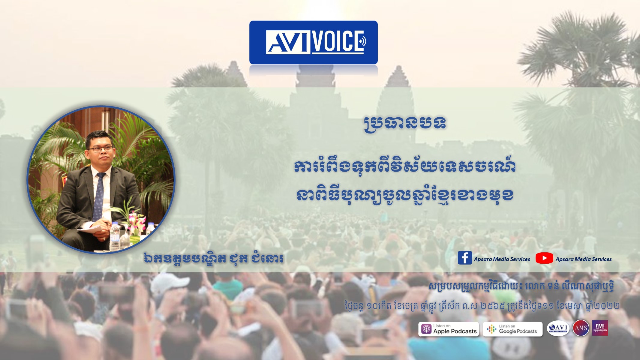 AVI VoiceAVI Voice៖ ការរំពឹងទុកពីវិស័យទេសចរណ៍នាពិធីបុណ្យចូលឆ្នាំខ្មែរខាងមុខAVI VoiceAVI Voice៖ ការរំពឹងទុកពីវិស័យទេសចរណ៍នាពិធីបុណ្យចូលឆ្នាំខ្មែរខាងមុខAVI VoiceAVI Voice៖ ការរំពឹងទុកពីវិស័យទេសចរណ៍នាពិធីបុណ្យចូលឆ្នាំខ្មែរខាងមុខ ពិធីបុណ្យចូលឆ្នាំប្រពៃណីជាតិខ្មែរ កំពុងតែខិតចូលមកដល់ ហើយតំបន់ទេសចរណ៍ជាច្រើនក្នុងប្រទេសកម្ពុជាក៏កំពុងតែមានការតៀមរៀបចំភ្ញៀវទេសចរណ៍សម្រាប់ដំណើរកម្សាន្តនាឱកាសបុណ្យខាងមុខនេះផងដែរ។ យ៉ាងណាមិញក្នុងឆ្នាំ២០២២ ប្រមុខរាជរដ្ឋាភិបាលលោកបានប្រកាសបើកឱ្យមានការប្រារព្ធពិធីបុណ្យចូលឆ្នាំយ៉ាងទូលំទូលាយជាងឆ្នាំមុនៗ ដែលជាកាលានុវត្តភាពមួយក្នុងការលើកស្ទួយ និងទ្រទ្រង់ដល់វិស័យទេសចរណ៍កម្ពុជាឱ្យមានដំណើរការឡើងវិញ។ ក្នុងកិច្ចសម្ភាសន៍នេះ ឯកឧត្ដមបណ្ឌិត ជុក ជំនោរ បានបកស្រាយពីមូលដ្ឋាននៃផលប៉ះពាល់ពីជំងឺកូវីដ-១៩ដល់វិស័យទេសចរណ៍នៅកម្ពុជា យន្តការនិងផែនការយុទ្ធសាស្រ្តនានារបស់រាជរដ្ឋាភិបាលដែលបានដាក់ចេញសម្រាប់ការស្ដារវិស័យទេសចរណ៍កម្ពុជា ក៏ដូចជាការរំពឹងទុកអំពីផលប្រយោជន៍ទូទៅពីទេសចរណ៍នាឱកាសបុណ្យចូលឆ្នាំប្រពៃណីខ្មែរខាងមុខនេះផងដែរ។ សំណួរទី ១៖ ជាបឋម តើជំងឺកូវីដ-១៩ បានផ្ដល់ផលប៉ះពាល់យ៉ាងដូចម្តេចខ្លះដល់វិស័យទេសចរណ៍នៅកម្ពុជាក្នុងរយៈពេលប៉ុន្មានឆ្នាំចុងក្រោយនេះ? ពាក់ព័ន្ធនឹងសំណួរទីមួយអំពីផលប៉ះពាល់ទៅលើ វិស័យទេសចរណ៍ដែលបណ្តាមកពីជំងឺកូវីដ១៩នេះ ទាំងអស់នេះយើងបានឃើញថាវិបត្តិជំងឺកូវីដ១៩នេះជាវិបត្តិសកល ដែលបានជះឥទ្ធិពលយ៉ាងខ្លាំងទៅលើវិស័យសេដ្ឋកិច្ច និយាយជារួមគឺក្នុងវិស័យទេសចរណ៍និយាយដោយឡែក។ ខ្ញុំសូមទាញចំណាប់អារម្មណ៌ថាមុនវិបត្តិកូវីដ១៩ យើងអាចនិយាយថាមុនឆ្នាំ២០២០ វិស័យទេសចរណ៍នៅកម្ពុជាគឺ មានបានបង្ហាញសញ្ញាវិជ្ជមានជាច្រើន ក្នុងការកើនឡើងជាបន្តបន្ទាប់ដូចជាការកើនឡើងជាបន្តបន្ទាប់ ដែលកាលពីឆ្នាំ២០១៩ យើងទទួលបានភ្ញៀវទេសចរណ៍ទៅដល់ជាង៦.៦លាននាក់ ជាមួយនិង ទេសចរណ៍ក្នុងស្រុកដល់ទៅជាង១១លាននាក់ ដែលនាំមកនូវចំណូលប្រមាណជាង ៥ពាន់លានដុល្លារ ចាក់បញ្ចូលទៅក្នុងសេដ្ឋកិច្ចជាតិ ក៏ប៉ុន្តែការរីករាលដាលនៃវិបត្តិជំងឺកូវីដ១៩ ដែលគ្មានមជ្ឈដ្ឋានណាដែលព្យាករដល់នោះគឺ ធ្វើឱ្យប៉ះពាល់យ៉ាងខ្លះទៅដលើវិស័យទេសចរណ៍ពិភពលោក ក៏ដូចជាកម្ពុជា ដែលធ្វើឱ្យចំនួនភ្ញៀវទេសចរណ៍អន្តរជាតិ ដែលមកលេងកម្ពុជាមានការធ្លាក់ចុះខ្លាំងមែនទែន ជាពិសេសនៅក្នុងឆ្នាំ២០២០ និង២០២១នេះ។ ជាក់ស្តែងនៅក្នុងឆ្នាំ២០២០ យើងទទួលបានភ្ញៀវអន្តរជាតិ ជាប្រមាណតែ ១.៣១លាននាក់...