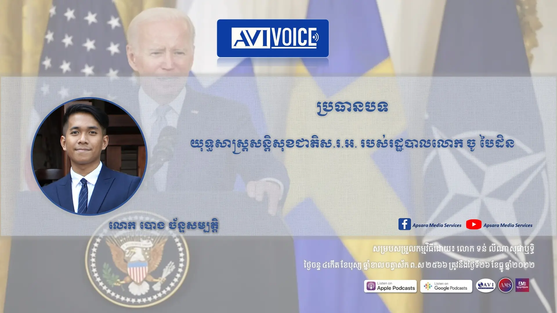 រដ្ឋាភិបាលស.រ.អ.របស់លោក ចូ បៃដិន ទើបតែបានដាក់ចេញនូវសៀវភៅយុទ្ធសាស្រ្តសន្តិសុខជាតិថ្មីរបស់ខ្លួន ដើម្បីជាផែនទីចង្អុលបង្ហាញសម្រាប់ការអនុវត្តជារួមនៅក្នុងការថែរក្សាទៅលើផ្នែកសន្តិសុខជាតិស.រ.អ.។ ក្នុងកិច្ចសម្ភាសន៍នេះ លោក បោង ច័ន្ទសម្បត្តិ បានពន្យល់អំពីខ្លឹមសារគោលនៃសៀវភៅយុទ្ធសាស្រ្តសន្តិសុខជាតិថ្មីរបស់ស.រ.អ.ក្រោមការដឹកនាំរបស់លោក ចូ បៃដិន និងឆ្លុះបញ្ចាំងអំពីចក្ខុវិស័យសន្តិសុខនាពេលអនាគតសម្រាប់ស.រ.អ. ក៏ដូចជាតំបន់ និងពិភពលោកទាំងមូលផងដែរ។ កម្រងសំណួរ – ចម្លើយលើប្រធានបទ សំណួរទី១៖ កាលពីខែតុលា ឆ្នាំ២០២២កន្លងទៅនេះ សហរដ្ឋអាមេរិក នៃរដ្ឋបាលលោកចូបៃដិនបានដាក់ចេញនូវយុទ្ធសាស្ត្រថ្មីមួយ ដើម្បីជាផែនទីចង្អុលបង្ហាញសម្រាប់ការអនុវត្តជារួមនៅក្នុងការថែរក្សាទៅលើផ្នែកសន្តិសុខជាតិរបស់ខ្លួន។ ជាបឋម ថាតើអ្វីទៅដែលជាយុទ្ធសាស្ត្រសន្តិសុខជាតិរបស់សហរដ្ឋអាមេរិកនេះ? ពីដំបូងមុននឹងយើងមើលទៅលើ ថាតើយុទ្ធសាស្ត្រសន្តិសុខជាតិរបស់រដ្ឋបាលលោកបៃដិនបានដាក់ចេញនូវគោលការណ៍ក៏ដូចជាចំណុចអ្វីខ្លះ យើងគួរតែមើលសិនថាតើអ្វីទៅគឺជាឯកសារមួយនេះ។ បើសិនជាយើងមើលទៅលើប្រភពដើមរបស់វា យុទ្ធសាស្ត្រសន្តិសុខជាតិរបស់សហរដ្ឋអាមេរិក គឺជាឯកសារមួយដែលអំណាចនីតិប្រតិបត្តិ មានន័យថាសេតវិមានរបស់សហរដ្ឋអាមេរិក គឺត្រូវតែបញ្ជូនទៅឱ្យសភារបស់ខ្លួនដើម្បីផ្តល់ ដំណឹងទៅដល់សមាជិកសភាឱ្យដឹង ថាតើអំណាចនីតិប្រតិបត្តិរបស់សហរដ្ឋអាមេរិកមាននូវអ្វីទៅដែលជាយុទ្ធសាស្ត្ររួមរបស់សហរដ្ឋអាមេរិក។ ជាទូទៅឯកសារនេះបើយោងតាមច្បាប់មាត្រាទី៦០៣នៃច្បាប់ក្នុងការកំណែទម្រង់ក្រសួងការពារជាតិសហរដ្ឋអាមេរិកឆ្នាំ១៩៨៦ បានចែងថាឯកសារនេះគួរតែបញ្ជូនពីអំណាចនីតិប្រតិបត្តិទៅកាន់សភាជារៀងរាល់ឆ្នាំ ប៉ុន្តែកន្លងចាប់ពីឆ្នាំ១៩៨៧មកដល់ថ្ងៃនេះគឺថាប្រធានាធិបតីរបស់សហរដ្ឋអាមេរិក គឺមិនបានបញ្ជូនទៅជារៀងរាល់ឆ្នាំទេ គឺតែងតែមានការចន្លោះពី៣ឆ្នាំ ២ឆ្នាំ ហើយជួនកាលទៅដល់៤ឆ្នាំផងដែរ។ ក្នុងឯកសារនេះ គឺកាលពីថ្ងៃទី១២ ខែតុលាឆ្នាំ២០២២ថ្មីៗនេះ ដូចបានលើកឡើងអម្បាញ់មិញ រដ្ឋបាលលោកចូបៃដិនបានដាក់ឯកសារសន្តិសុខជាតិលើកដំបូងរបស់ខ្លួន ក្នុងនោះគឺបានចែងអំពីអត្ថប្រយោជន៍ គោលដៅ ក៏ដូចជាចក្ខុវិស័យរបស់ខ្លួនក្រោមការដឹកនាំរបស់លោកចូបៃដិនផងដែរ។ សំណួរទី២៖ តើមានអ្វីដែលជាចំណុចថ្មីក៏ដូចជាការប្រែប្រួលទៅលើយុទ្ធសាស្ត្រសន្តិសុខជាតិ នៅក្នុងសៀវភៅថ្មីមួយនេះ ហើយវាបានឆ្លុះបញ្ចាំងអ្វីខ្លះអំពីគោលបំណងយុទ្ធសាស្ត្ររបស់សហរដ្ឋអាមេរិក នៅក្នុងវិស័យសន្តិសុខជាតិ និងពិភពលោកទាំងមូលនាពេលអនាគតផងដែរ? ដើម្បីឱ្យបងប្អូនអ្នកស្ដាប់បានយល់បន្ថែមទៅលើ ភាព