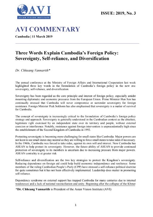 Now it is necessary for Cambodia to recalibrate its political doctrine based on the concept of self- reliance, which is very much influenced by the Buddhist philosophy of life. Cambodia should not expect other countries to protect its interests and sovereignty; it needs to rely on itself. Realistically, no country or person is more invested in the interests of Cambodia than Cambodians themselves. Cambodia will be unable to maintain its sovereignty unless it is economically independent and resilient.