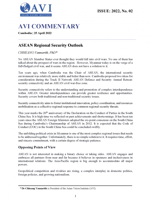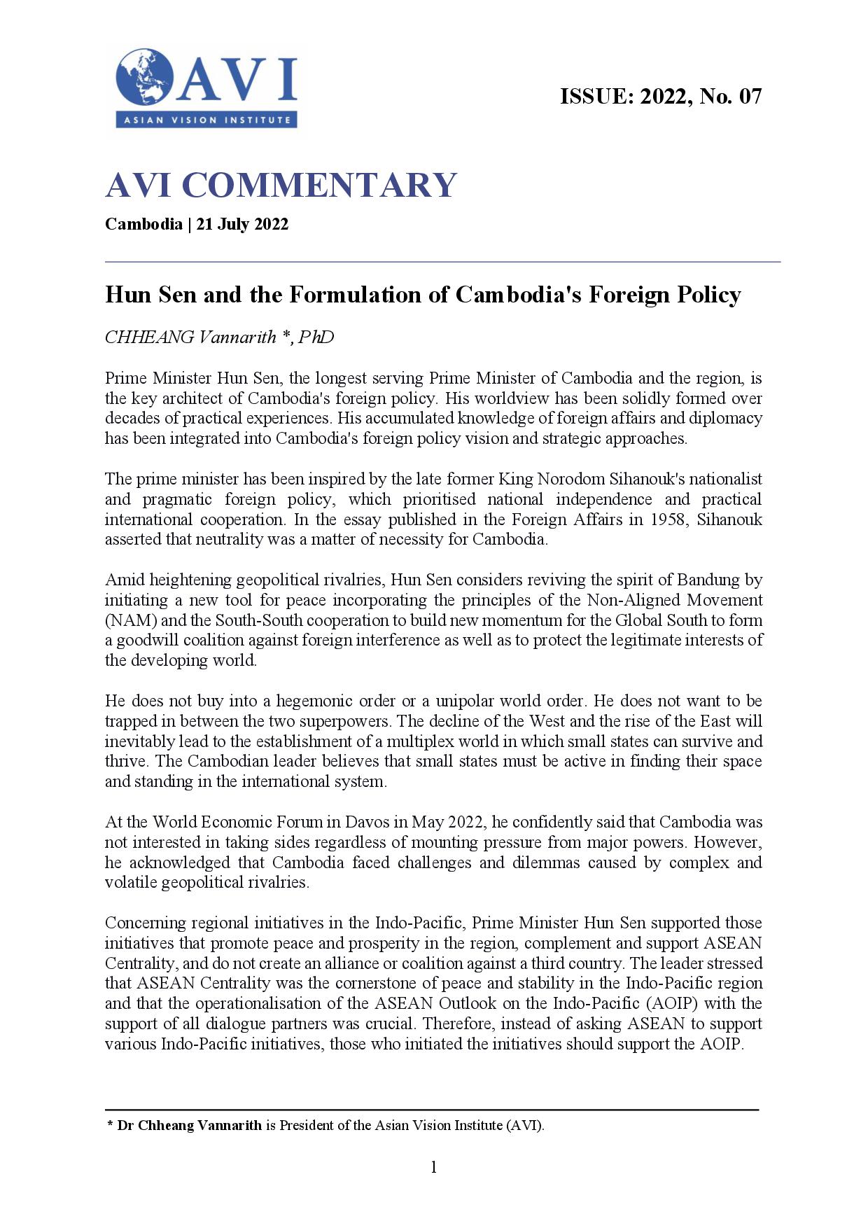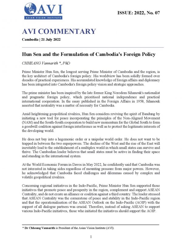 The concept of sovereignty is increasingly critical to the formulation of Cambodia’s foreign policy strategy and approach. Sovereignty is generally understood in the Cambodian context as the absolute, legitimate right exercised by an independent state over its territory and people, without external coercion or interference. Notably, resistance against foreign intervention is unprecedentedly high since the establishment of the Second Kingdom of Cambodia in 1993.