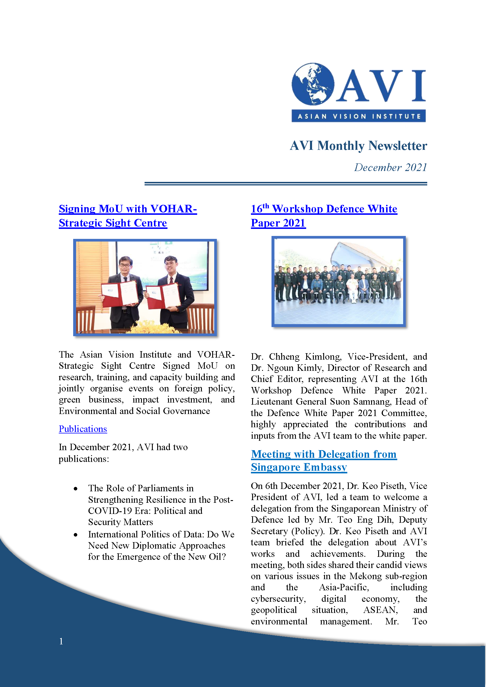 In December 2021, the Asian Vision Institute collaborated with Konrad-Adenauer Stiftung (KAS) to publish an edited book volume entitled “Cambodia’s ASEAN Chairmanship in 2022: Priorities and Challenges”.