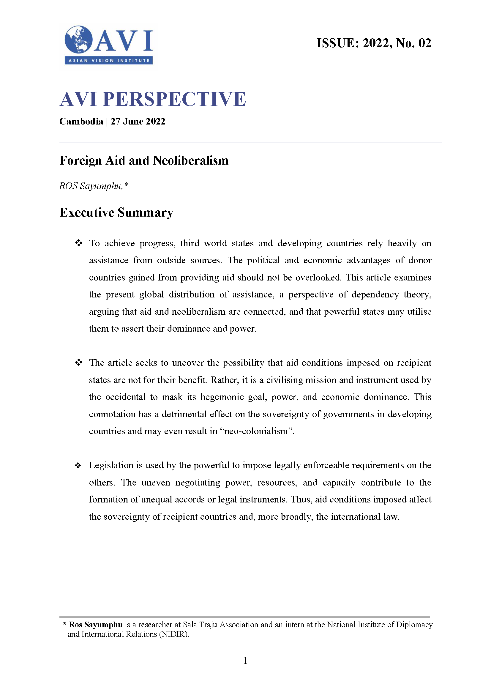 This article examines the current global distribution of aid from the perspective of dependency theory. It argues that foreign aid and neoliberalism are intertwined. Third-world countries rely heavily on foreign aid for their growth. In providing aid, donor countries receive more advantages than recipient countries. Donor countries can use aid to mask their hegemonic ambitions, economic dominance, and power. Thus, the sovereignty of third-world states could be undermined, resulting in neo-colonialism.
