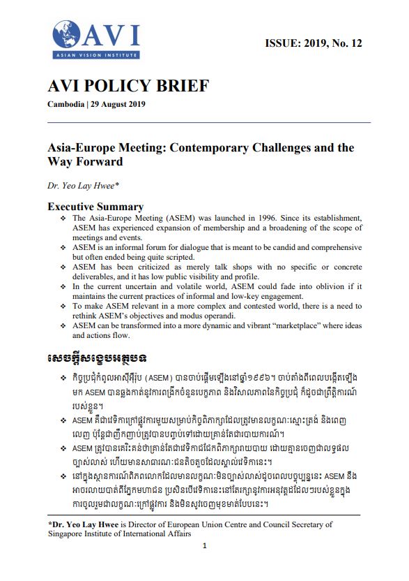The Asia-Europe Meeting (ASEM) is now into its third decade. In 2020, Cambodia will host the 13th ASEM Summit. There are pressing questions that ASEM has to address. For example, what can the Cambodian government do to generate interest and attention on the meeting? How can ASEM establish relevancy in an increasingly complex and contested world with all its uncertainties and volatilities such as growing right wing nationalist populism, backlash against globalization, Trump administration’s unpredictable decisions, and a litany of other challenges threatening to undermine multilateral institutions and forums that foster dialogue and cooperation? How can ASEM with members that are increasingly at odds with each other survive the erosion of trust, the peddling of fear, and increasing antics to carve out spheres of influence in the international system? Can ASEM double down on the promise of supporting multilateralism, as it said it would at the 12th ASEM summit in October 2018?
