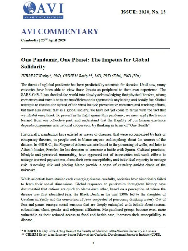 AVI COMMENTARY ISSUE: 2020, No. 13 | One Pandemic, One Planet: The Impetus for Global Solidarity