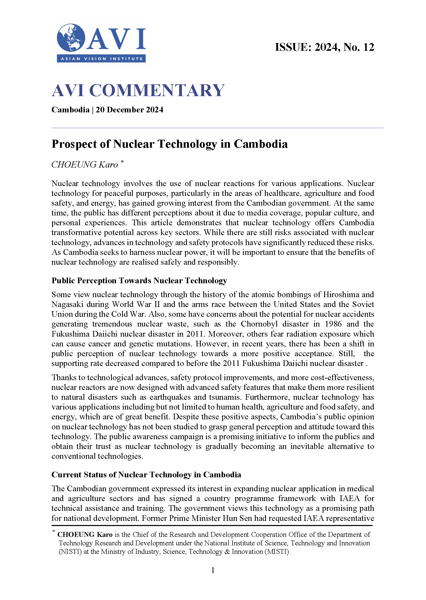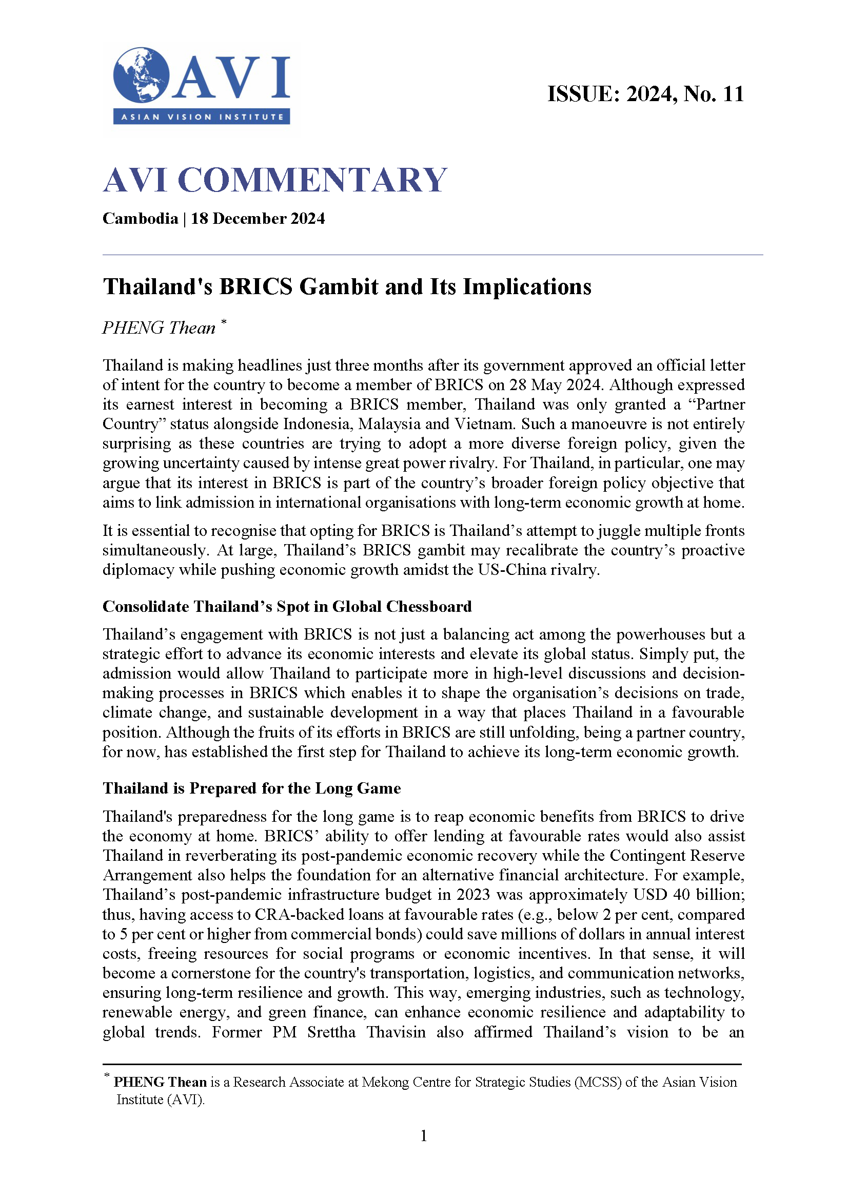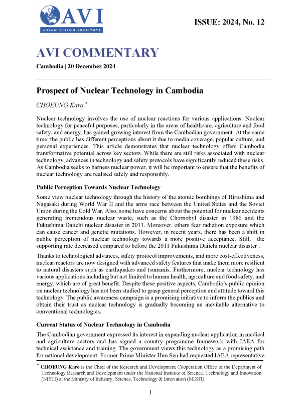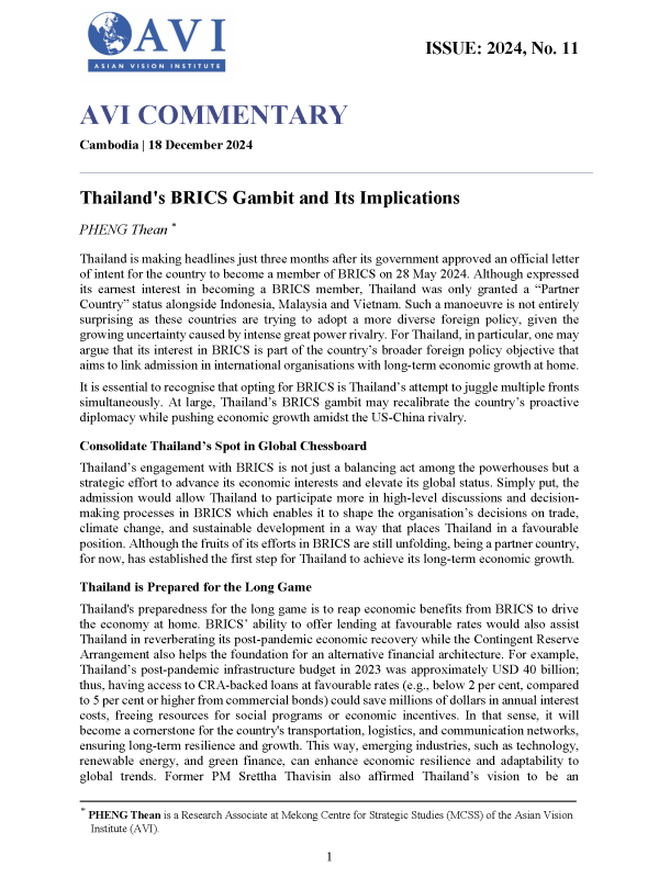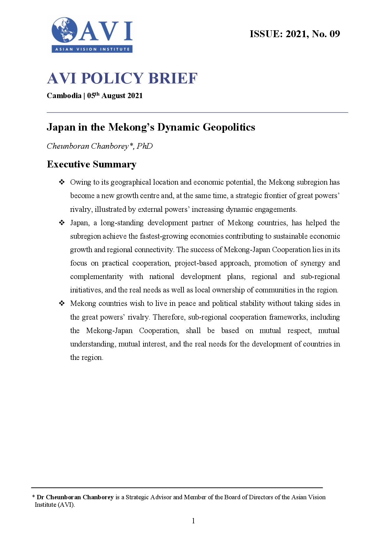 Dr. Cheunboran Chanborey argues that the Mekong subregion has become a new growth centre and, at the same time, a strategic frontier of great powers’ rivalry, illustrated by external powers’ increasing dynamic engagements. In this context, he highlights the aspiration of the Mekong countries to live in peace and political stability and stay aloof from the great powers’ rivalry.
