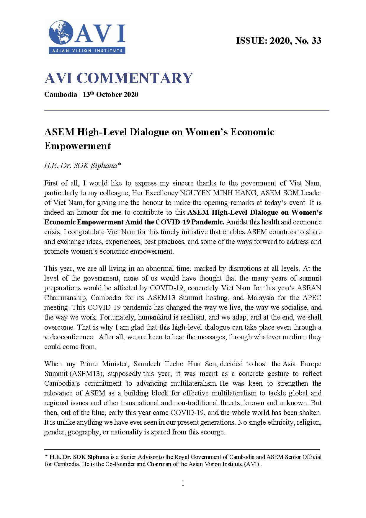 AVI COMMENTARY ISSUE: 2020, No. 33 | ASEM High-Level Dialogue on Women’s Economic Empowerment
