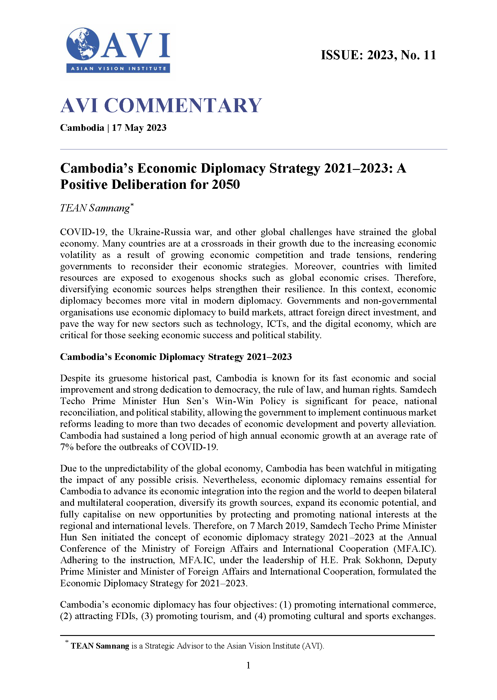 AVI COMMENTARY ISSUE: 2023, No. 11 | Cambodia’s Economic Diplomacy Strategy 2021–2023: A Positive Deliberation for 2050
