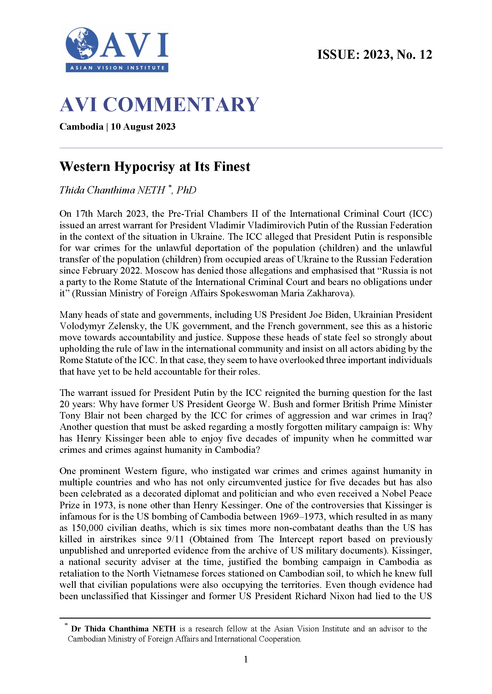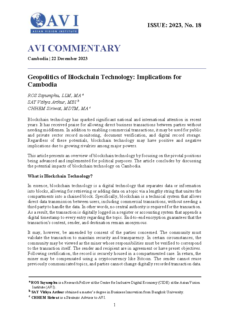 AVI COMMENTARY ISSUE: 2023, No. 18 | Geopolitics of Blockchain Technology: Implications for Cambodia