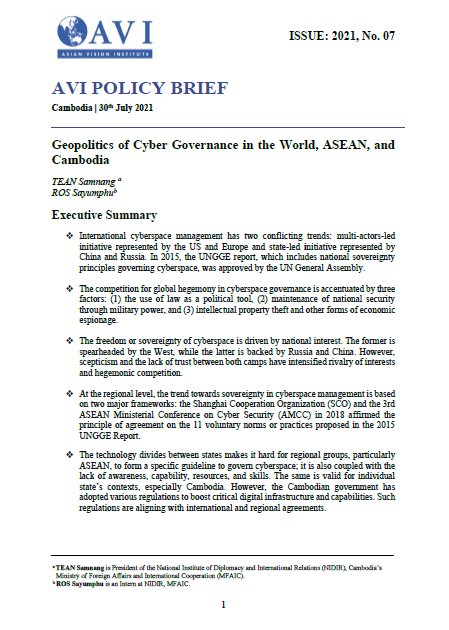 AVI POLICY BRIEF ISSUE: 2021, No. 07 | Geopolitics of Cyber Governance in the World, ASEAN, and Cambodia