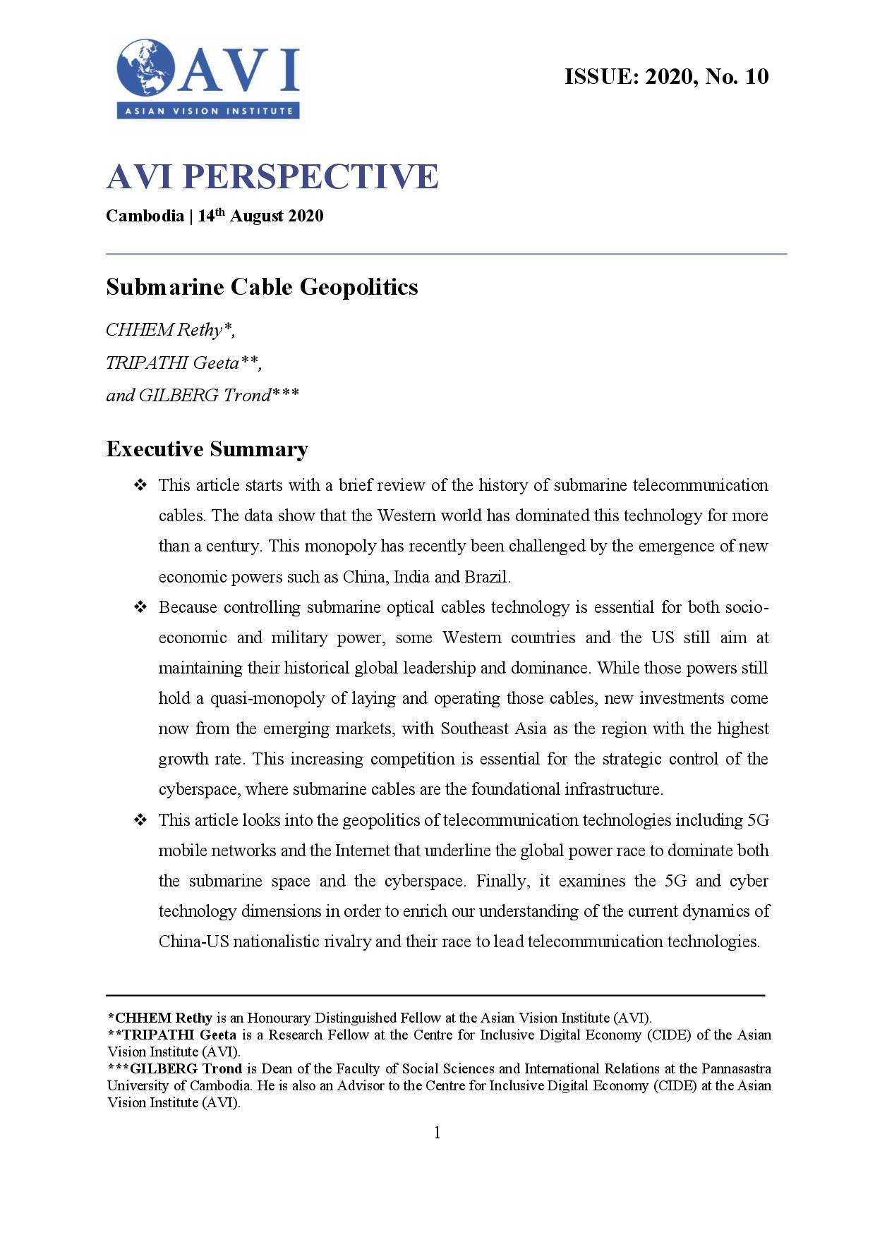 "SUBMARINE CABLE GEOPOLITICS" - by CHHEM Rethy, TRIPATHI Geeta, and GILBERG Trond Submarine telecommunication technology has been dominated by the Western world for more than a century, but this monopoly has recently been challenged by the emergence of new economic powers such as China, India and Brazil. This paper looks into the geopolitics and the […]