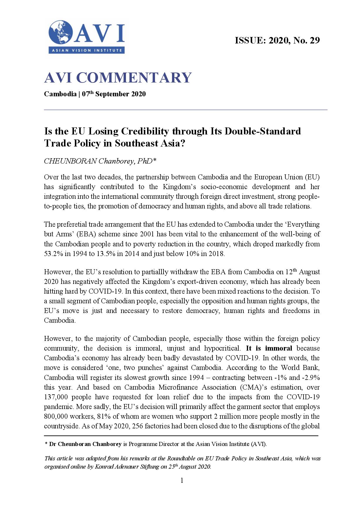 AVI COMMENTARY ISSUE: 2020, No. 29 | Is the EU Losing Credibility through Its Double-Standard Trade Policy in Southeast Asia?