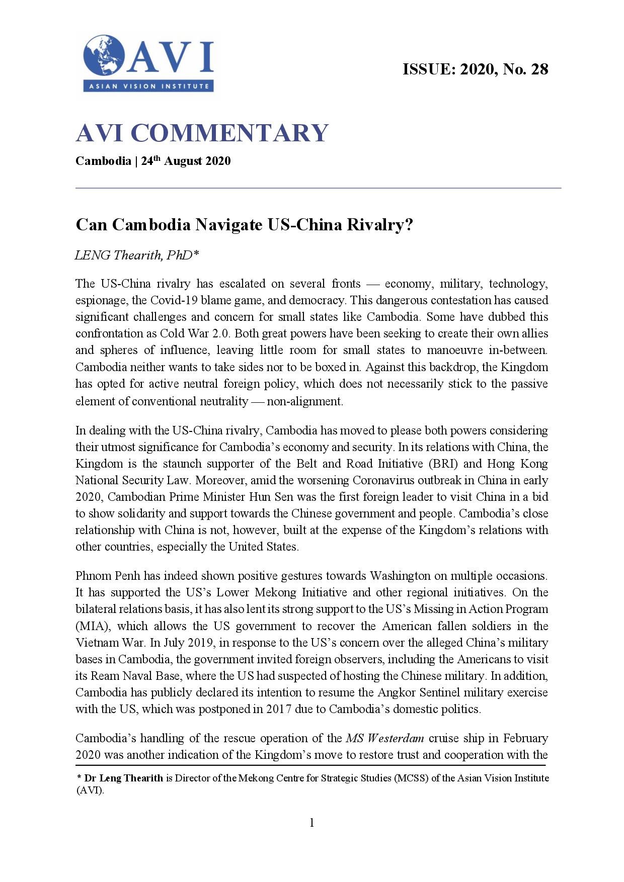AVI COMMENTARY ISSUE: 2020, No. 28 | Can Cambodia Navigate US-China Rivalry?