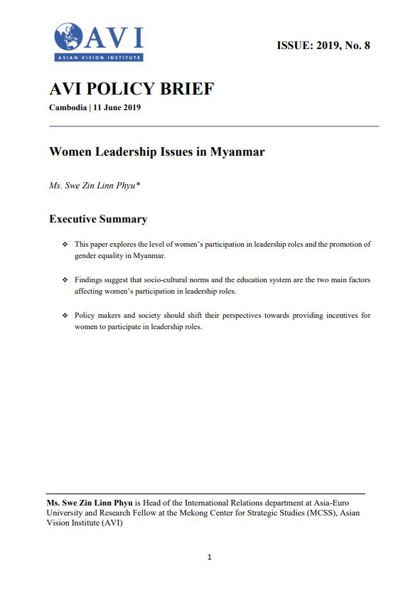 AVI POLICY BRIEF ISSUE: 2019, No. 8 | Women Leadership Issues in Myanmar
