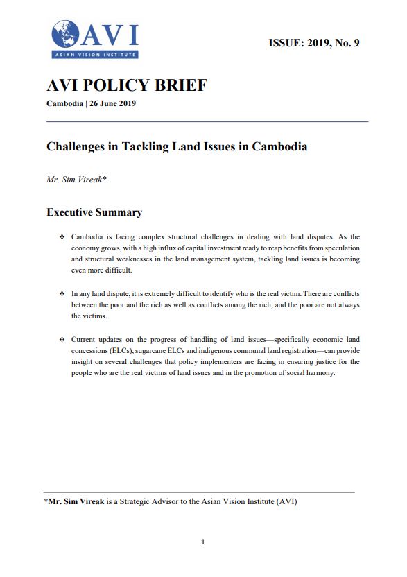 AVI POLICY BRIEF ISSUE: 2019, No. 9 | Challenges in Tackling Land Issues in Cambodia