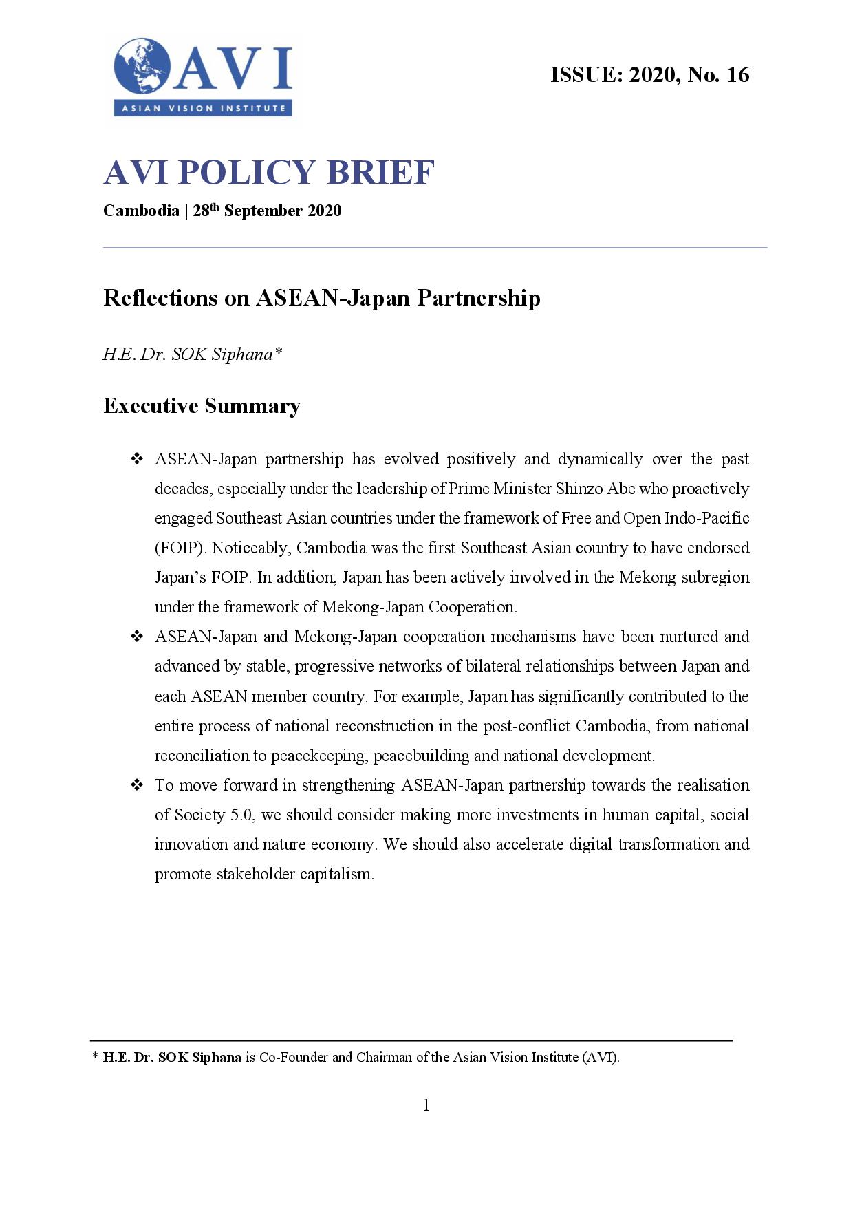 AVI POLICY BRIEF ISSUE: 2020, No. 16 | Reflections on ASEAN-Japan Partnership