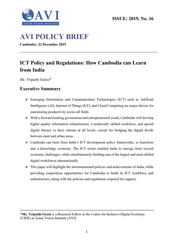 AVI POLICY BRIEF ISSUE: 2019, No. 16 | ICT Policy and Regulations: How Cambodia can Learn from India