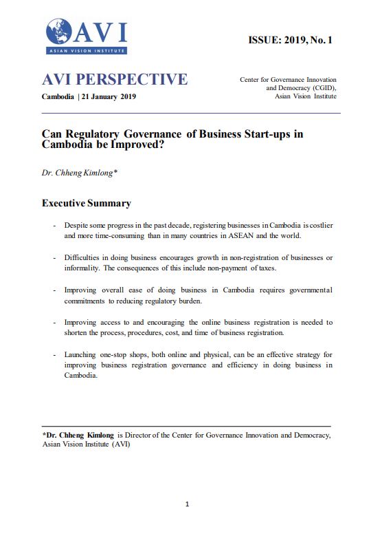 AVI PERSPECTIVE ISSUE: 2019, No. 1 | Can Regulatory Governance of Business Start-ups in Cambodia be Improved?