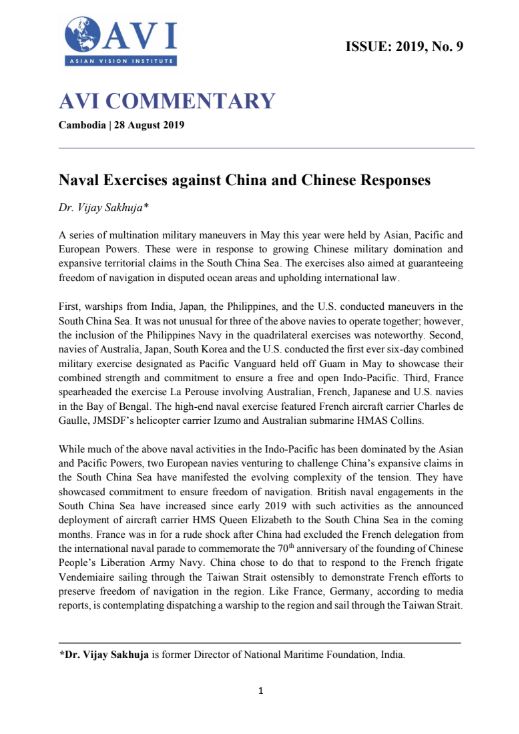 AVI COMMENTARY ISSUE: 2019, No. 9 | Naval Exercises against China and Chinese Responses