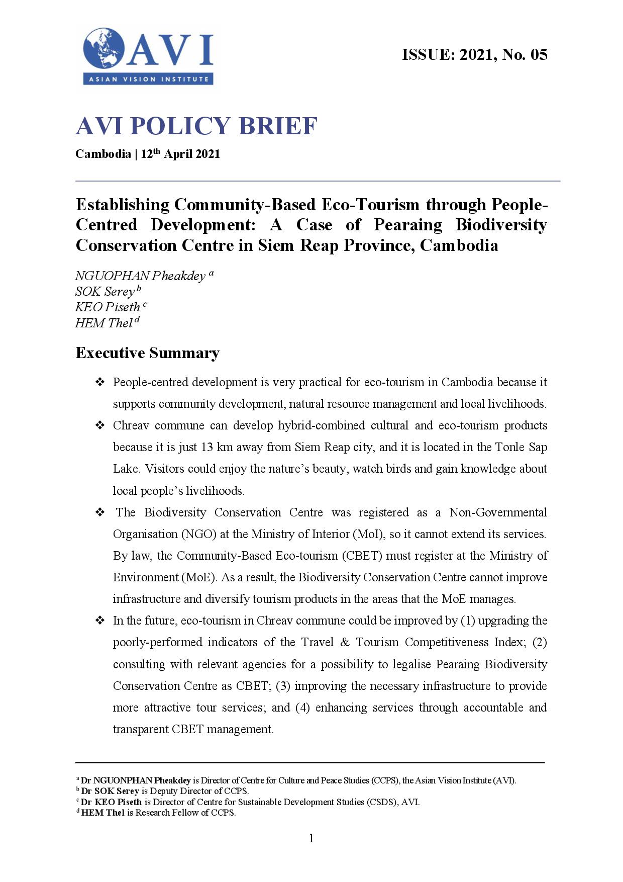 AVI POLICY BRIEF ISSUE: 2021, No. 05 | Establishing Community-Based Eco-Tourism through People- Centred Development: A Case of Pearaing Biodiversity Conservation Centre in Siem Reap Province, Cambodia
