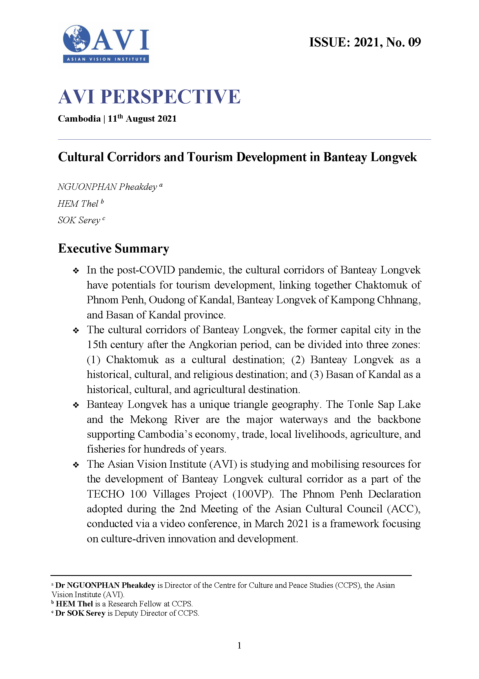 AVI PERSPECTIVE ISSUE: 2021, NO. 09 | Cultural Corridors and Tourism Development in Banteay Longvek