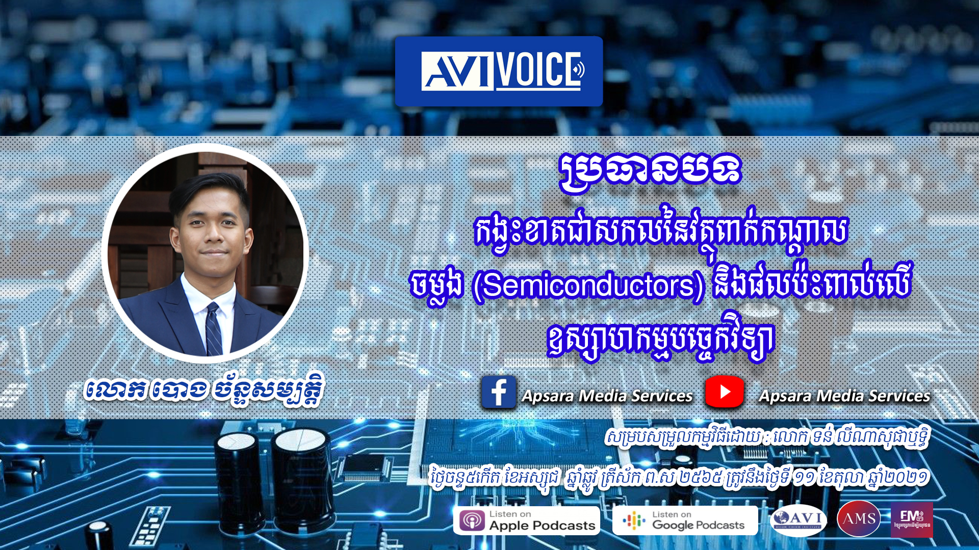 AVI Voiceកង្វះខាតជាសកល Semiconductor និងផលប៉ះពាល់លើឧស្សាហកម្មបច្ចេកវិទ្យាAVI Voiceកង្វះខាតជាសកល Semiconductor និងផលប៉ះពាល់លើឧស្សាហកម្មបច្ចេកវិទ្យាAVI Voiceកង្វះខាតជាសកល Semiconductor និងផលប៉ះពាល់លើឧស្សាហកម្មបច្ចេកវិទ្យា វត្ថុពាក់កណ្ដាលចម្លង (Semiconductor) ឬអាចហៅម៉្យាងទៀតបានថាជា បន្ទះឈីប ជាធាតុផ្សំដ៏សំខាន់នៅក្នុងវិស័យបច្ចេកវិទ្យាដែលមិនអាចខ្វះបាន ហើយវាក៏ជះឥទ្ធិពលទៅលើជីវភាពរស់នៅប្រចាំថ្ងៃរបស់យើងផងដែរ។ បច្ចុប្បន្ន ផលិតកម្មនៃវត្ថុពាក់កណ្ដាលចម្លងនេះ ត្រូវបានប្រទេសមហាអំណាចយកមកប្រកួតប្រជែងគ្នាក្នុងវិស័យឧស្សាហកម្មបច្ចេកវិទ្យា ជាពិសេសប្រទេសដែលសម្បូរទៅដោយវត្ថុធាតុដើម និងបច្ចេកវិទ្យាសម្រាប់ការផលិតនេះ។ ក្នុងកិច្ចសម្ភាហ៍នេះ លោក បោង ច័ន្ទសម្បត្តិ បានពន្យល់អំពីសារសំខាន់នៃវត្ថុពាក់កណ្ដាលចម្លង សម្រាប់ជីវភាពរបស់នៅរបស់យើង ក៏ដូចជាផលប៉ះពាល់នៃកង្វះខាតវត្ថុពាក់កណ្ដាលចម្លងនៅក្នុងវិស័យឧស្សាហកម្មបច្ចេកវិទ្យានាពេលបច្ចុប្បន្ន។ សំណួរទី១៖ តើអ្វីទៅជាវត្ថុពាក់កណ្តាលចម្លង ឬ (Semiconductors)? បើយើងមើលទៅលើនិយមន័យ Semiconductor ឬក៏ហៅម្យ៉ាងទៀតថាជា បន្ទះឈីប ដែលធ្វើឡើងដោយ Silicon ដែលបន្ទះនោះគឺផ្គុំឡើងដោយមាននៅ Transistor រាប់លាននៅក្នុងហ្នឹងដែល Transistor នោះអនុញ្ញាតឲ្យមាននូវការចម្លងអគ្គិសនី ហើយអនុញ្ញាតឲ្យបន្ទះឈីបនោះធ្វើការដំណើរការទិន្នន័យដែលសកម្មភាពទាំងពីរនេះគឺវាធ្វើឡើងពេលយើងយក ឈីប ទាំងអស់នោះទៅដាក់ចូលទៅក្នុងឧបករណ៍បច្ចេកវិទ្យា ហើយវាធ្វើឲ្យឧបករណ៍ទាំងអស់នោះមានតែសកម្មភាពនេះអាចប្រើប្រាស់បានដើម្បីបំពេញនូវតម្រូវការប្រចាំថ្ងៃពួកយើង។ សំណួរទី២៖ តើវត្ថុពាក់កណ្តាលចម្លង និងឧស្សាហកម្មបច្ចេកវិទ្យា មានសារសំខាន់យ៉ាងដូចម្តេចសម្រាប់ជីវភាពរស់នៅរបស់យើង នាពេលបច្ចុប្បន្ន និងអនាគត? ពាកព័ន្ធនឹងវិសាលភាព ឬក៏តួនាទីសំខានរបស់ Semiconductor នេះគឺដោយសារតែសកលលោកយើងសព្វថ្ងៃសតវត្យន៍ទី ២១ នេះគឺពឹងផ្អែកទៅលើបច្ចេកវិទ្យា និងឧបករណ៍អេឡិចត្រូនិចខ្លាំងមែនទែន អញ្ចឹងដោយសារតែ Semiconductor នេះគឺជាធាតុផ្សំដែលមិនអាចខ្វះបាន អាចចាត់ទុកជាបេះដូងរបស់ឧបករណ៍អេឡិចត្រូនិចទាំងអស់។ អញ្ចឹងប្រសិនជាអត់មាន Semiconductor ឧបករណ៍ទាំងអស់នឹងមិនអាចដំណើរការបានទេ សកលលោកអាចនឹងមានការរាំស្ទះក្នុងការបោះជំហានទៅមុខ។ ហើយបើយើងមើលទៅលើថា តើ Semiconductor អាចដាក់នៅក្នុងឧបករណ៍អ្វីខ្លះ គឺយើងឃើញថាមានឧបករណ៍សឹងតែទាំងអស់ដែលយើងប្រើប្រាស់សព្វថ្ងៃរួមមាន...