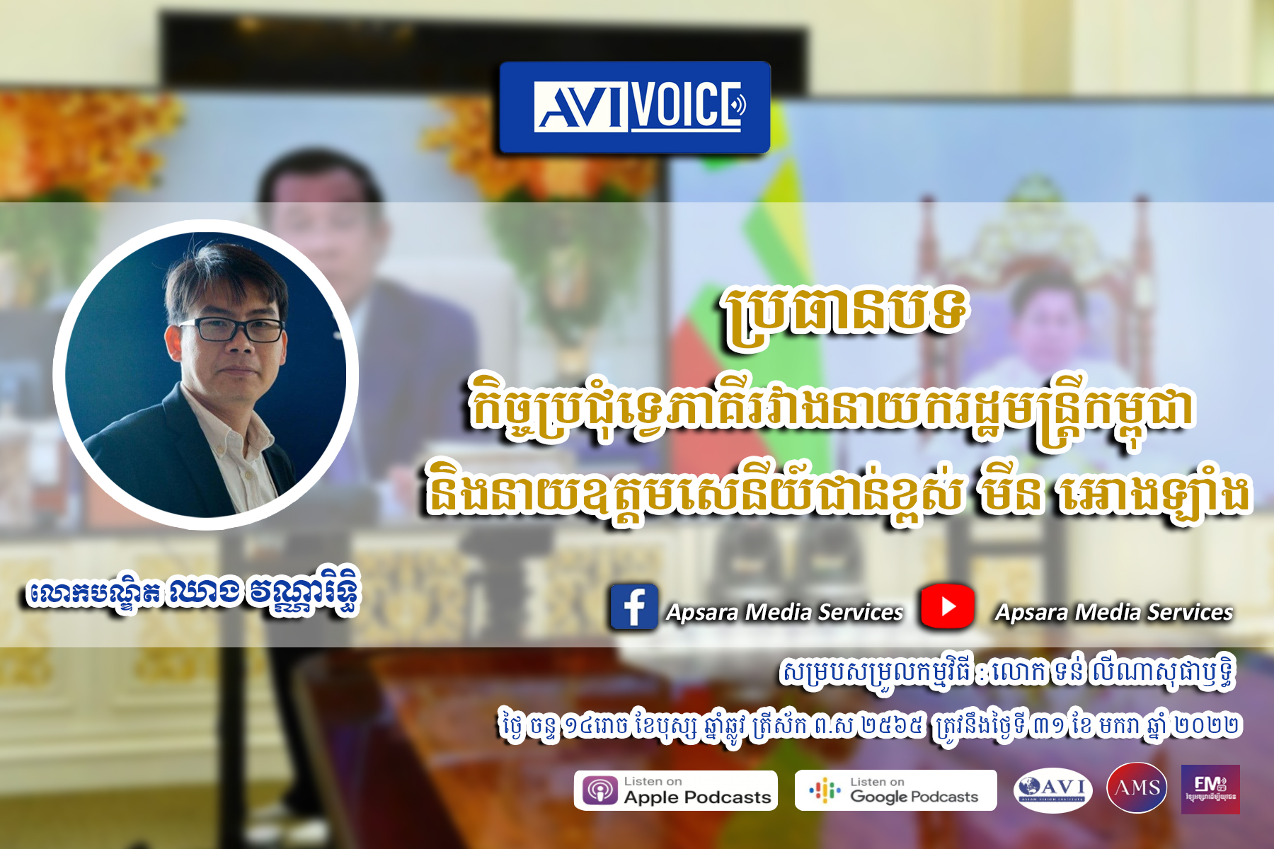AVI Voiceកិច្ចប្រជុះទ្វេភាគីរវាងនាយករដ្ឋមន្ត្រីកម្ពុជានិងនាយឧត្តមសេនីយ៍ជាន់ខ្ពស់ មីន អោងឡាំអAVI Voiceកិច្ចប្រជុះទ្វេភាគីរវាងនាយករដ្ឋមន្ត្រីកម្ពុជានិងនាយឧត្តមសេនីយ៍ជាន់ខ្ពស់ មីន អោងឡាំអAVI Voiceកិច្ចប្រជុះទ្វេភាគីរវាងនាយករដ្ឋមន្ត្រីកម្ពុជានិងនាយឧត្តមសេនីយ៍ជាន់ខ្ពស់ មីន អោងឡាំអ                នៅរសៀលថ្ងៃទី២៦ ខែមករា ឆ្នាំ២០២២ សម្ដេចតេជោនាយករដ្ឋមន្រ្តីកម្ពុជា បានអញ្ជើញជួបពិភាក្សាជាមួយឯកឧត្ដមនាយឧត្ដមសេនីយ៍ជាន់ខ្ពស់ មីន អោងឡាំង តាមប្រព័ន្ធវីដេអូ ដើម្បីចែករំលែកនូវព័ត៌មាន និងស្ថានការណ៍វិវត្តន៍នានានៅក្នុងប្រទេសមីយ៉ាន់ម៉ា។ អំឡុងពេលនៃកិច្ចប្រជុំនោះផងដែរ សម្ដេចតេជោក៏បានលើកឡើងនូវសំណើចំនួន ៤ចំនុចទៅកាន់មេដឹកនាំរបបសឹកភូមាផ្ទាល់ សំដៅការសម្របសម្រួលដល់ដំណើរការដោះស្រាយវិបត្តិនយោបាយ និងអំពើហឹង្សានានាដែលមាននៅក្នុងប្រទេសភូមា។ នៅក្នុងកិច្ចសម្ភាសន៍នេះ លោកបណ្ឌិត ឈាង វណ្ណារិទ្ធ បានពន្យល់ពីគោលគំនិតនៃសំណើទាំង ៤ចំនុច របស់សម្ដេចតេជោទៅលើស្ថានការណ៍នៅភូមា និងលើកឡើងពីស្ថានការណ៍វិវត្តន៍នានាពាក់ព័ន្ធទៅនឹងអំពើហឹង្សា ភាពតានតឹង និងជំនួយមនុស្សធម៌ទៅកាន់ប្រជាជនមីយ៉ាន់ម៉ា។ សំណួរទី ១៖   សម្ដេចតេជោ ហ៊ុន សែន នាយករដ្ឋមន្រ្តីនៃព្រះរាជាណាចក្រកម្ពុជា ទើបតែបានអញ្ជើញដំណើរទស្សនៈកិច្ចការងារទៅកាន់ប្រទេសមីយ៉ាន់ម៉ា កាលពីដើមខែមករាកន្លងទៅនេះ។ ហើយកាលពីរសៀលថ្ងៃទី២៦ ខែមករា ឆ្នាំ២០២២នេះ សម្ដេចក៏បានអញ្ញើញ ឯកឧត្ដមនាយឧត្ដមសេនីយ៍ជាន់ខ្ពស់មីន អោងឡាំង ដើម្បីជួបសន្ទនាទៅលើបញ្ហាពាក់ព័ន្ធនានាតាមប្រព័ន្ធវីដេអូ។ តើអ្វីទៅដែលជារបៀបវារៈគោលនៅក្នុងជំនួបពិភាក្សាលើកនេះ? ជាទូទៅប្រទេសកម្ពុជាដែលជាប្រធានអាស៊ានឆ្នាំនេះ ខំធ្វើកិច្ចប្រជុំពិគ្រោះយោបល់ជាមួយបណ្ដាប្រទេសនានាដែលជាសមាជិកអាស៊ាន។ យើងឃើញថាកន្លងទៅមានកិច្ចប្រជុំទ្វេភាគី...