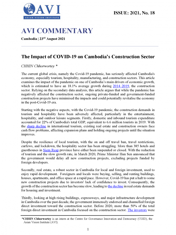 AVI COMMENTARY ISSUE: 2021, NO. 18 | The Impact of COVID-19 on Cambodia’s Construction Sector