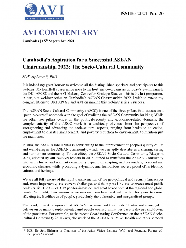 AVI COMMENTARY ISSUE: 2021, NO. 20 | Cambodia’s Aspiration for a Successful ASEAN Chairmanship, 2022: The Socio-Cultural Community