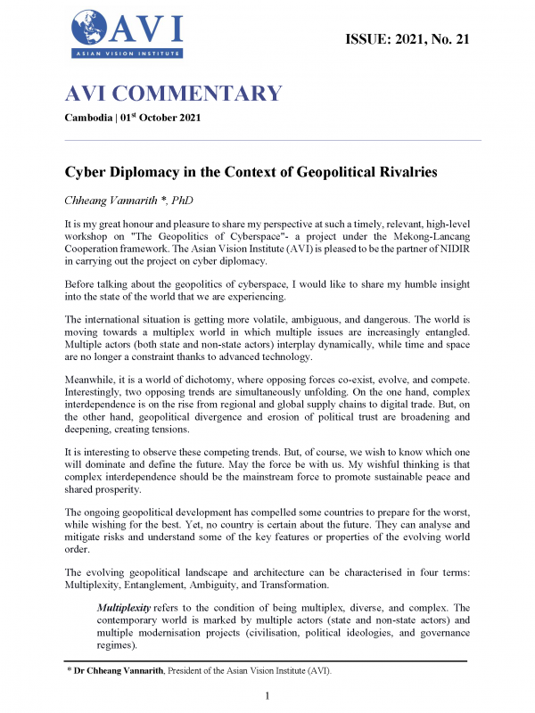 AVI COMMENTARY ISSUE: 2021, NO. 21 | Cyber Diplomacy in the Context of Geopolitical Rivalries
