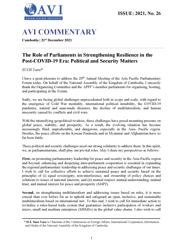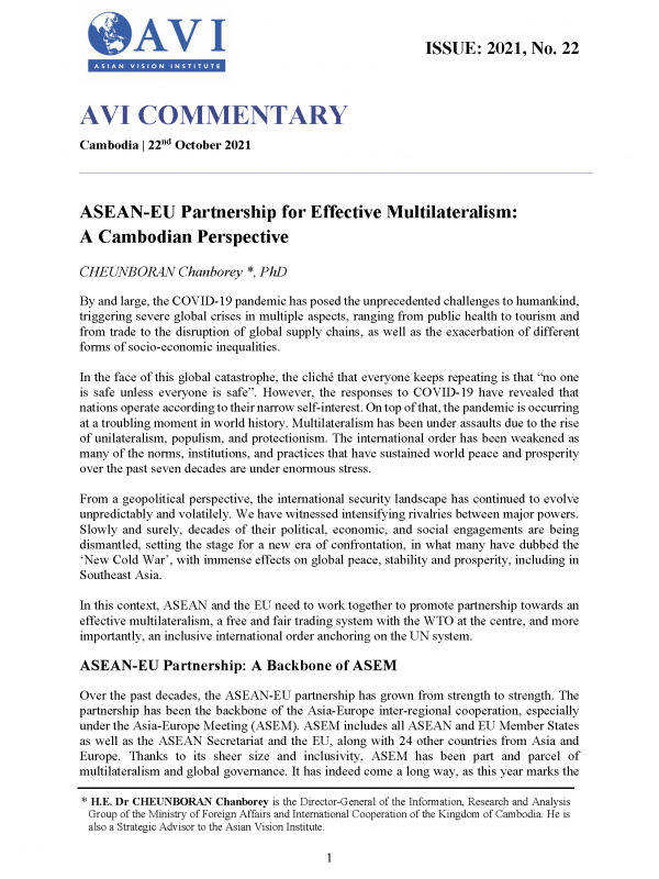 AVI COMMENTARY ISSUE: 2021, NO. 22 | ASEAN-EU Partnership for Effective Multilateralism: A Cambodian Perspective