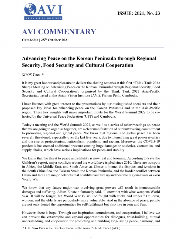 AVI COMMENTARY ISSUE: 2021, NO. 23 | Advancing Peace on the Korean Peninsula through Regional Security, Food Security and Cultural Cooperation