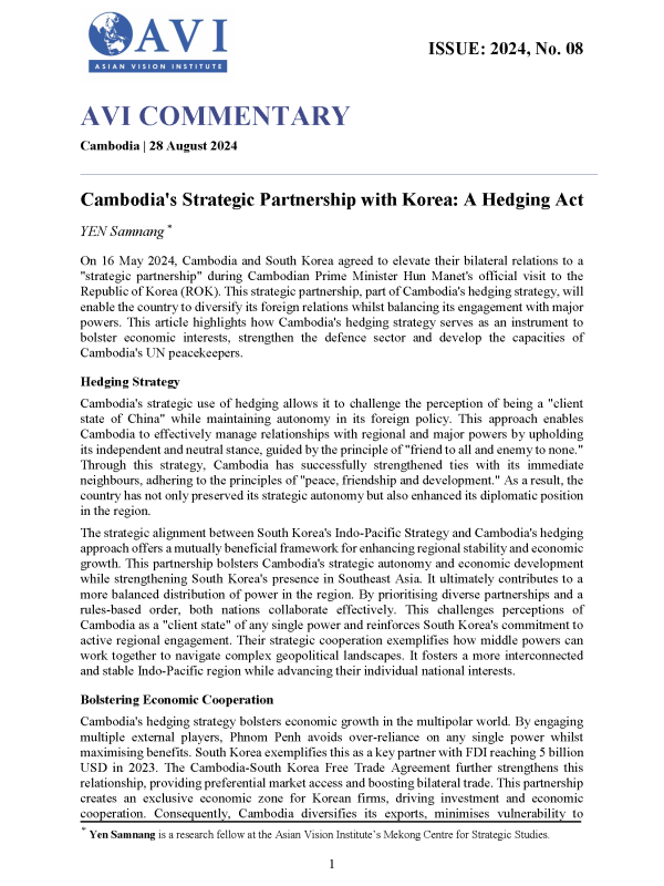 AVI COMMENTARY ISSUE: 2024, No. 08 | Cambodia’s Strategic Partnership with Korea: A Hedging Act