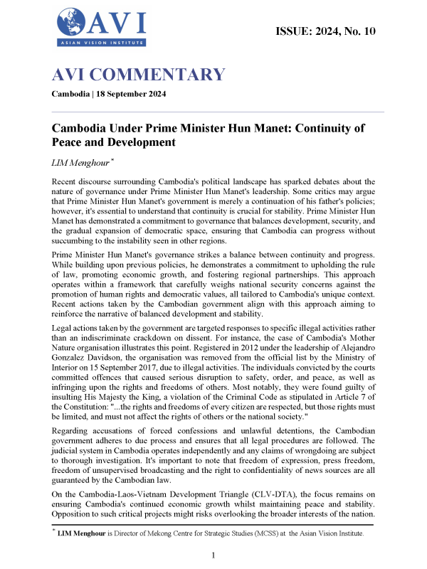 AVI COMMENTARY ISSUE: 2024, No. 10 | Cambodia Under Prime Minister Hun Manet: Continuity of Peace and Development