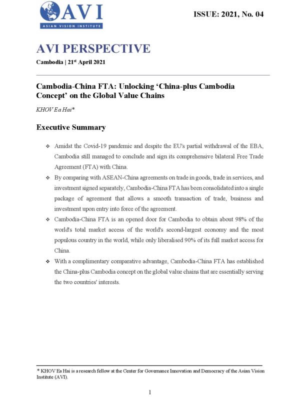 AVI PERSPECTIVE ISSUE: 2021, No. 04 | Cambodia-China FTA: Unlocking ‘China-plus Cambodia Concept’ on the Global Value Chains