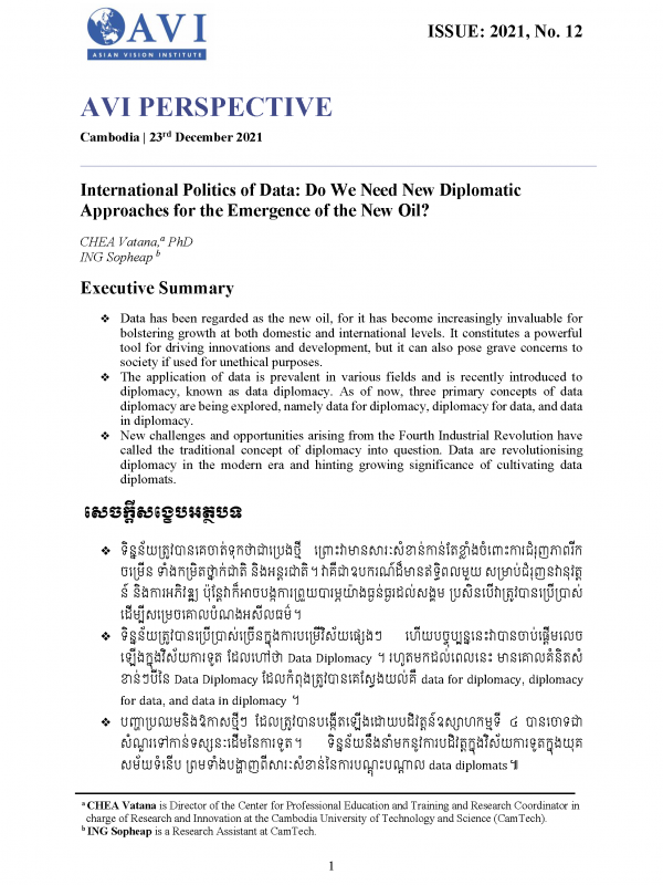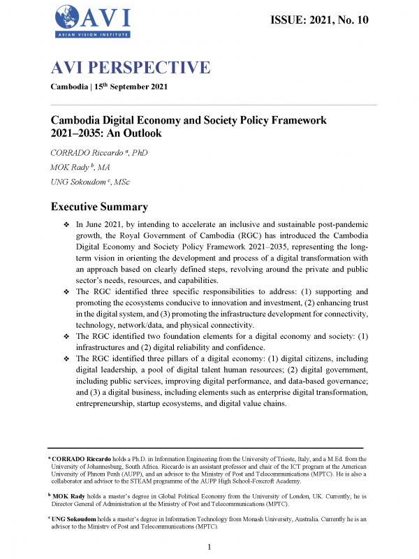 AVI PERSPECTIVE ISSUE: 2021, No. 10 | Cambodia Digital Economy and Society Policy Framework 2021–2035: An Outlook