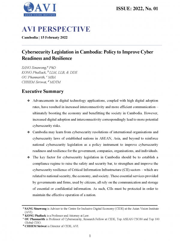 AVI PERSPECTIVE ISSUE: 2022, No. 01 | Cybersecurity Legislation in Cambodia: Policy to Improve Cyber Readiness and Resilience