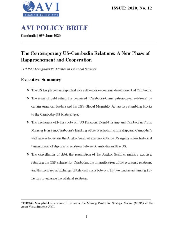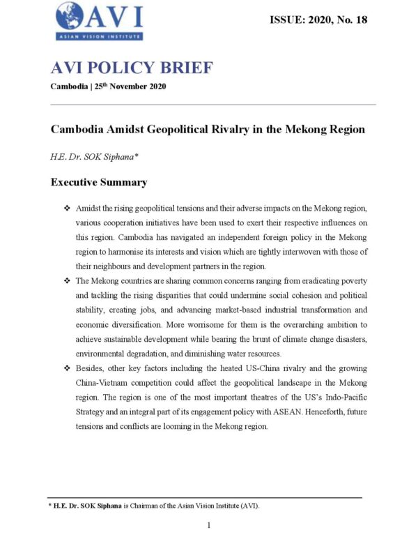 AVI POLICY BRIEF ISSUE: 2020, No. 18 | Cambodia Amidst Geopolitical Rivalry in the Mekong Region