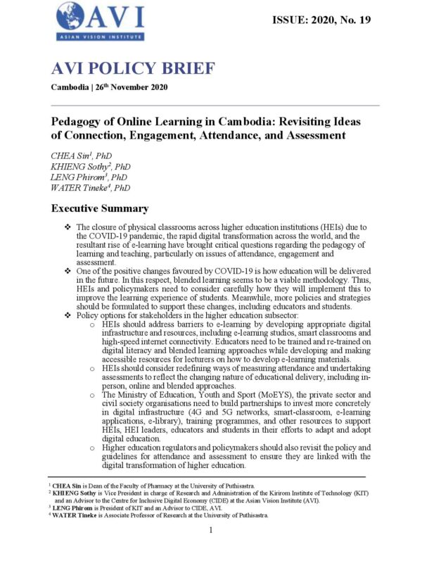 AVI POLICY BRIEF ISSUE: 2020, No. 19 | Pedagogy of Online Learning in Cambodia: Revisiting Ideas of Connection, Engagement, Attendance, and Assessment