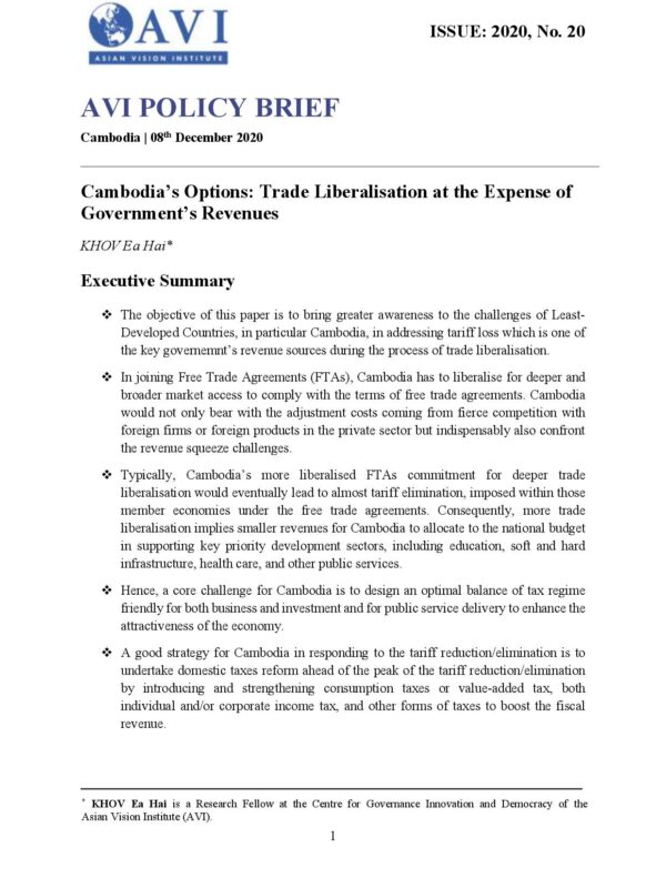 AVI POLICY BRIEF ISSUE: 2020, No. 20 | Cambodia’s Options: Trade Liberalisation at the Expense of Government’s Revenues