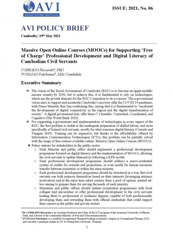 AVI POLICY BRIEF ISSUE: 2021, No. 06 | Massive Open Online Courses (MOOCs) for Supporting ‘Free of Charge’ Professional Development and Digital Literacy of Cambodian Civil Servants